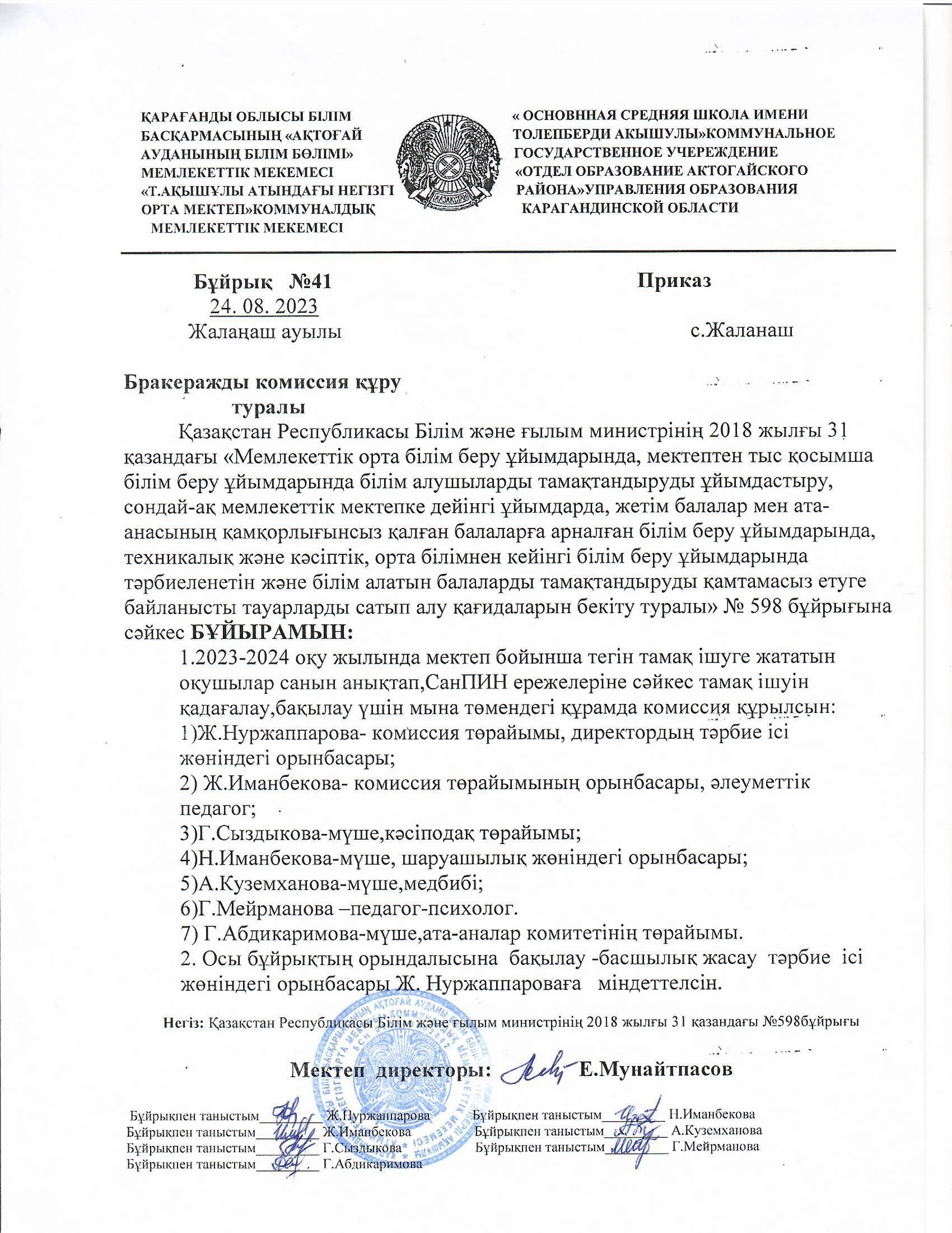Бракераж комиссия құру туралы бұйрық