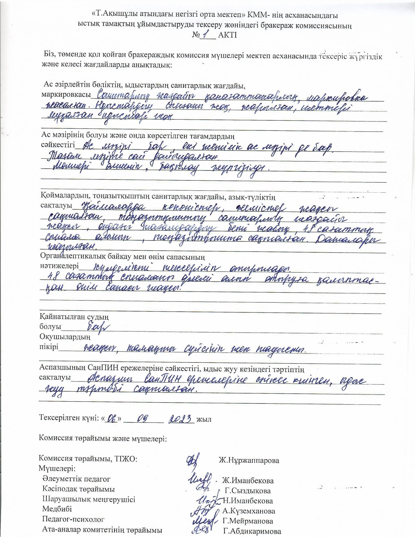 Бракераж комиссиясының №1 тексеру акті