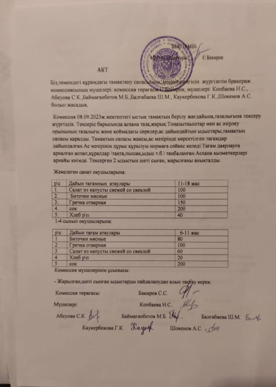 Мектептегі тамақтану сапасының мониторингісін жүргізетін бракераж комиссиясы отырысының хаттамасы