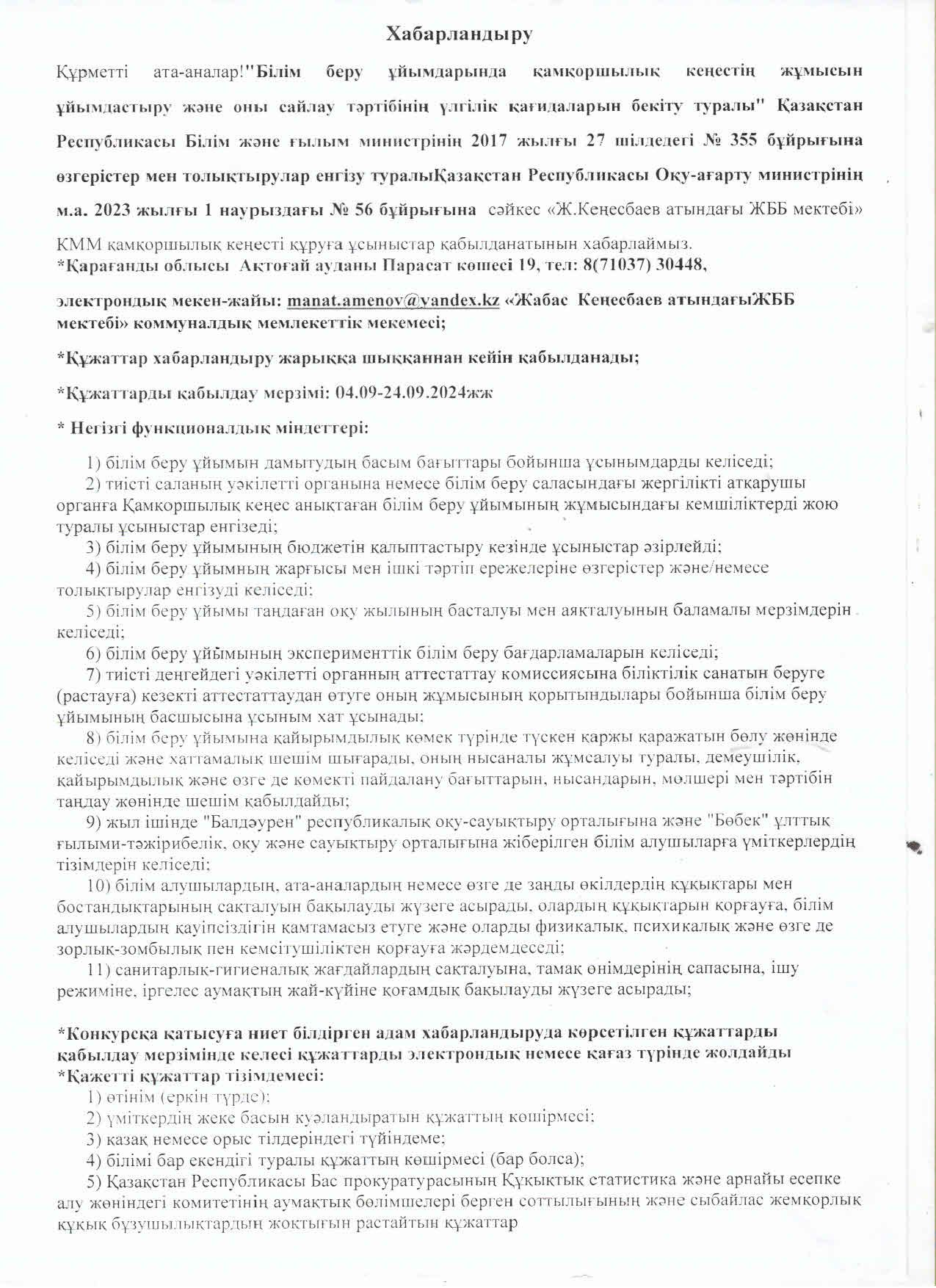 Мектептің Қамқоршылық кеңес құрамы бойынша жұмыс құжаттары