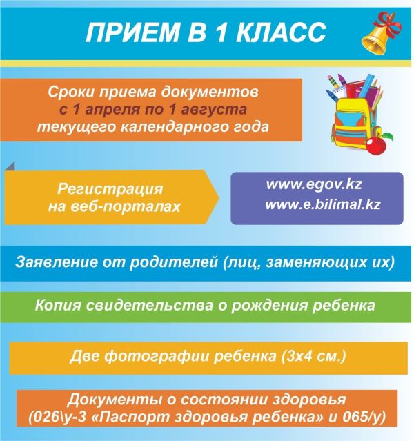Қазақстан Республикасы Білім және ғылым министрінің 2020 жылғы 24 маусымдағы №264 бұйрығына сәйкес 2023-2024 оқу жылына 1-сыныпқа құжаттарды қабылдау 2023 жылдың 1 сәуірінен бастап e.bilimal.kz порт…