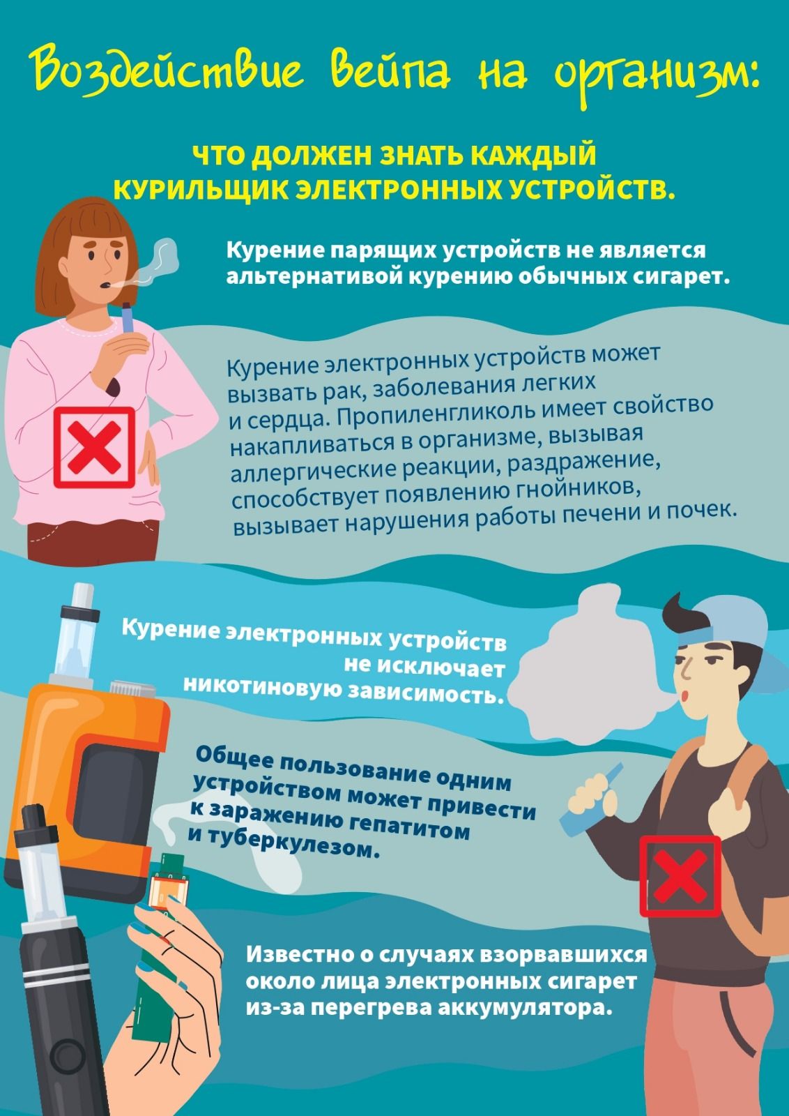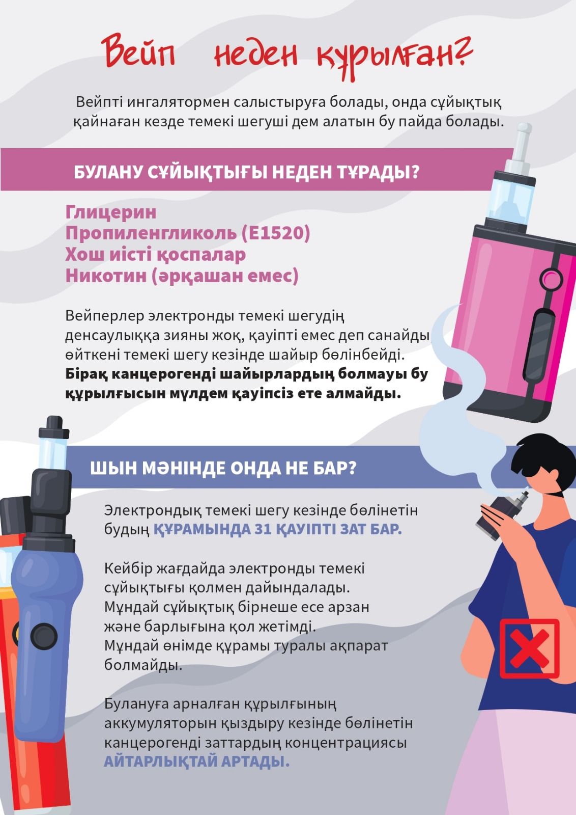 Электрондық темекі (вейп) тұтыну жастар арасында кең таралған, бірақ оның денсаулыққа зиянды әсерлері туралы білу маңызды. Міне, оқушыларға арналған негізгі ақпарат: