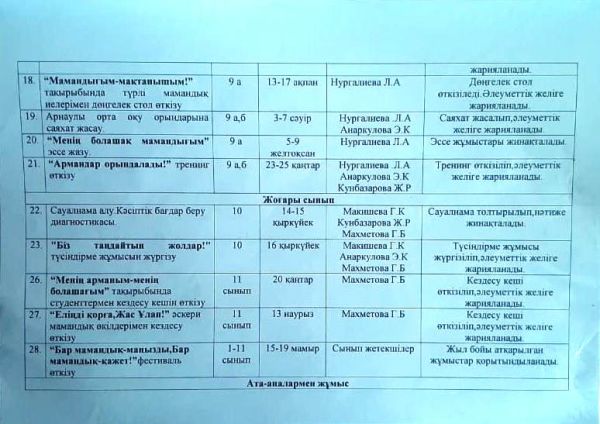 05.03.2024 ж 8-10 сынып қыз балалар арасында жыныстық қолсұғушылықты алдын-алу мақсатында "Ерте жүктілік" тақырыбында бейнеролик көрсетіліп, талқыланып кеңестер берілді.