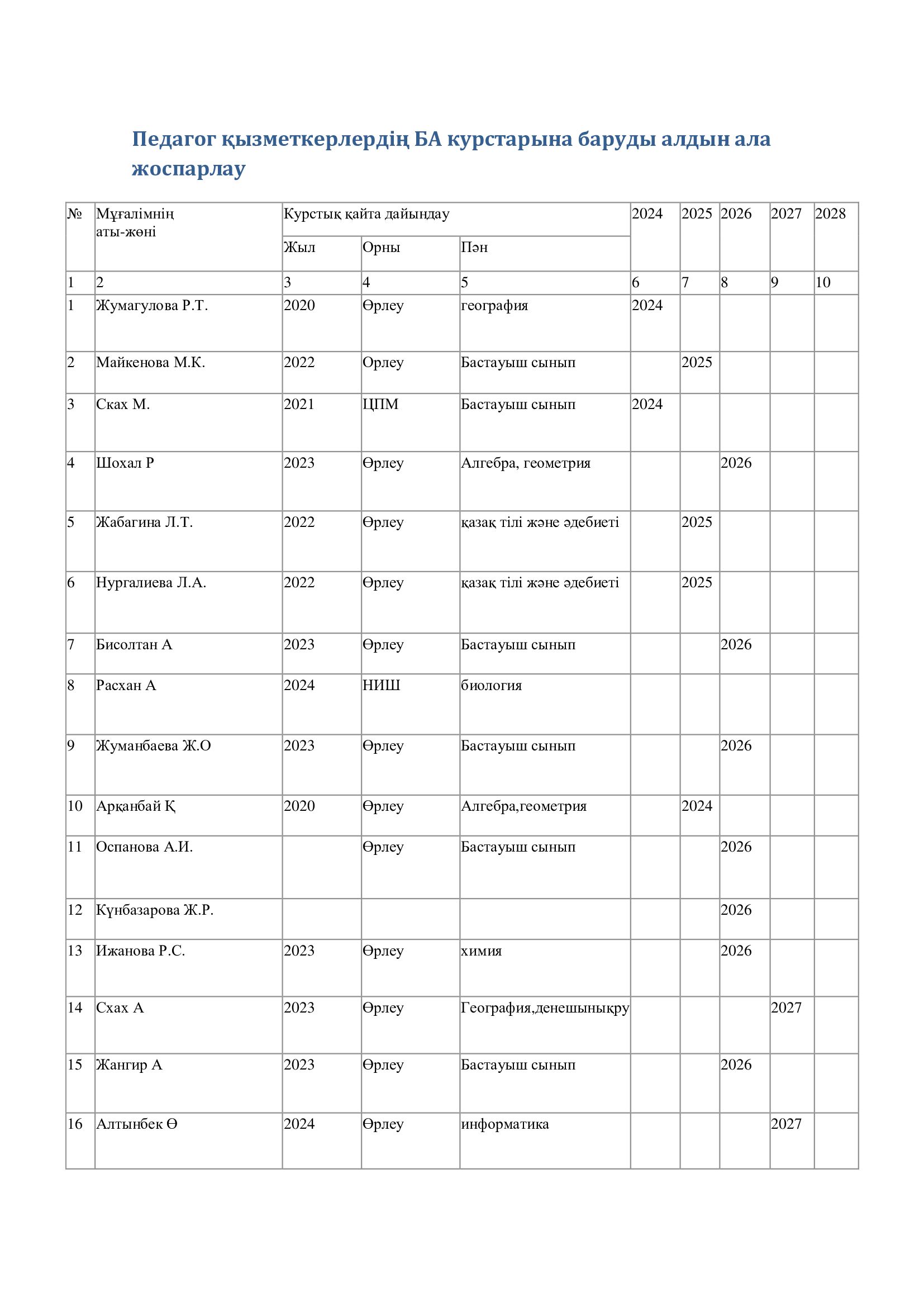 Педагог қызметкерлердің БА курстарына баруды алдын ала жоспарлау