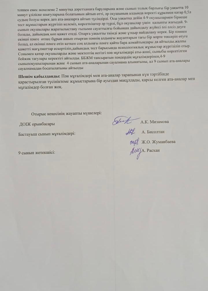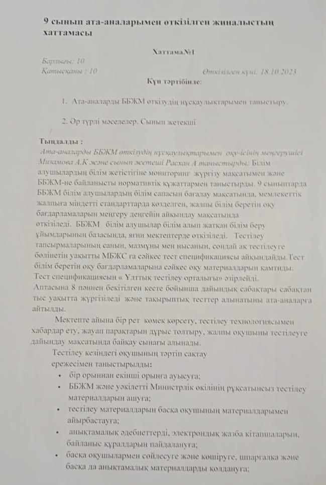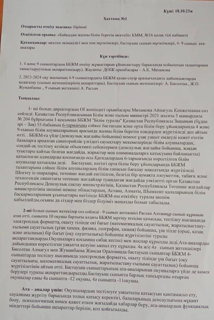 9-сынып ата-аналарымен өткізілген жиналыстың Хаттамасы №1