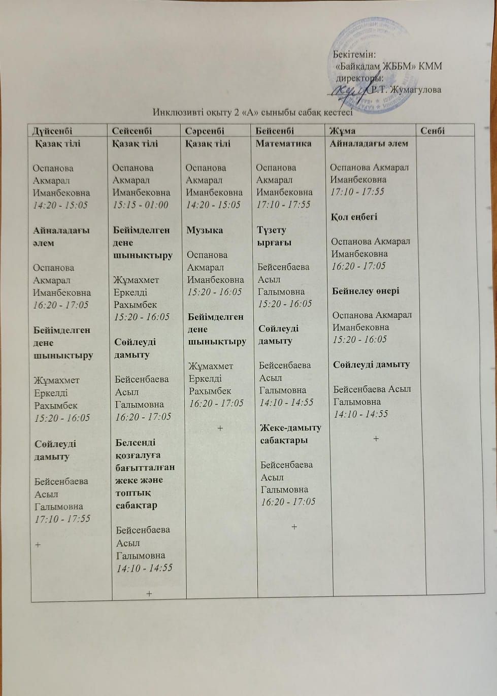 Инклюзивті оқыту сабақ кестесі