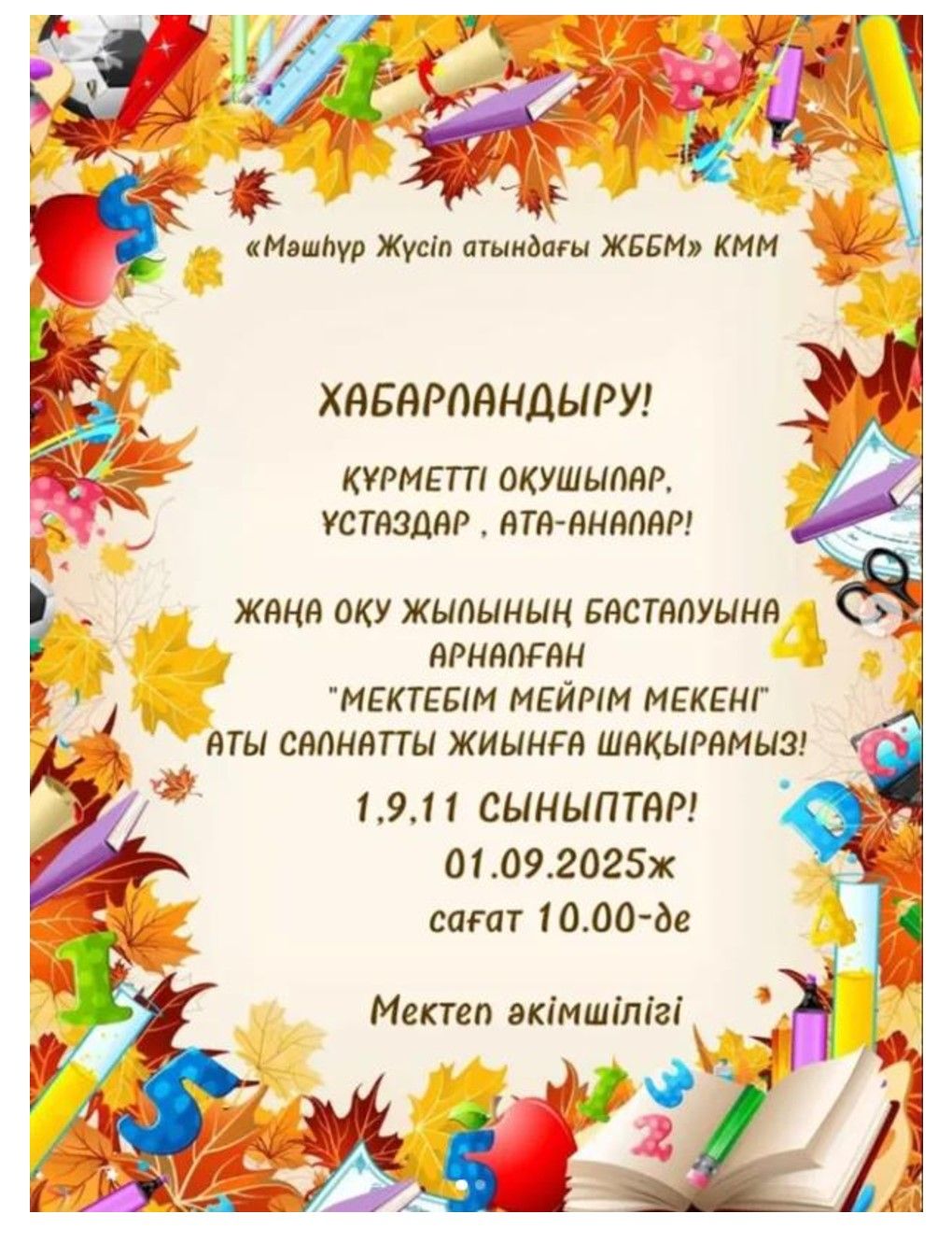 Сіздерді жаңа оқу жылының басталуына арналған