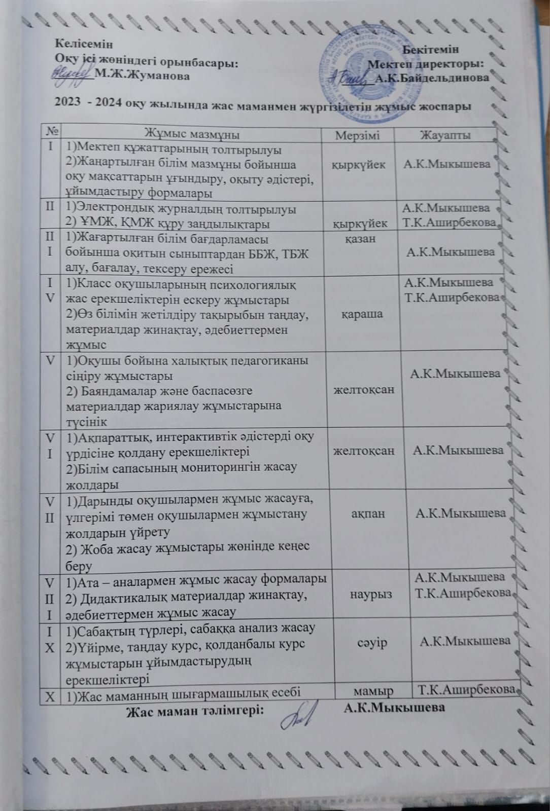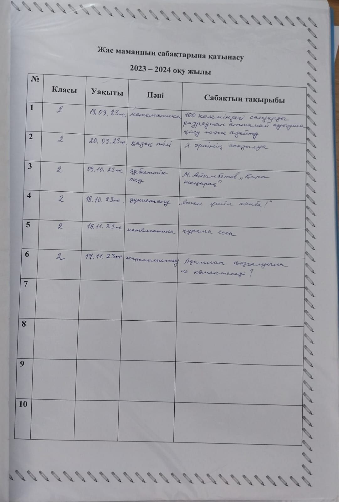 2023-2024 оқу жылында жас маманның сабақтарына қатынасу кестесі.