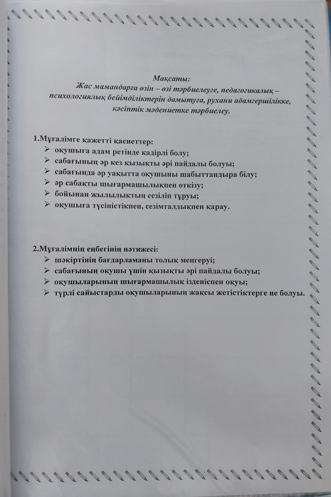 Жас мамандарға өзін-өзі тәрбиелеуге, педагогикалық-психологиялық бейімділіктерін дамытуға, рухани адамгершілікке, кәсіптік мәдениетке тәрбиелеу