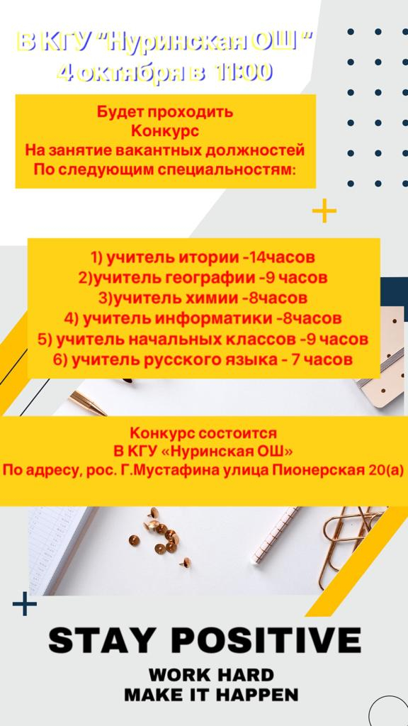1. учитель истории 14 часов 2. учитель географии 9 часов 3. учитель химии 8 часов 4. учитель информатики 8 часов 5. учитель начальных классов 9 часов 6. учитель русского языка 7 часов