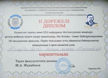 "Академик Е.А. Бөкетов атындағы Қарағанды университеті" КЕАҚ ұйымдастырумен оқушылары арасында биология пәнінен өткізілген аймақтық олимпиадада 10 "А"- сынып оқушысы Тұрсынхан То…