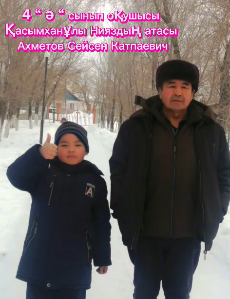 Мағжан Жұмабаев атындағы жалпы білім беретін мектебінің 4 "Ә" сынып оқушысы Қасымханұлы Нияз атасымен бірге.