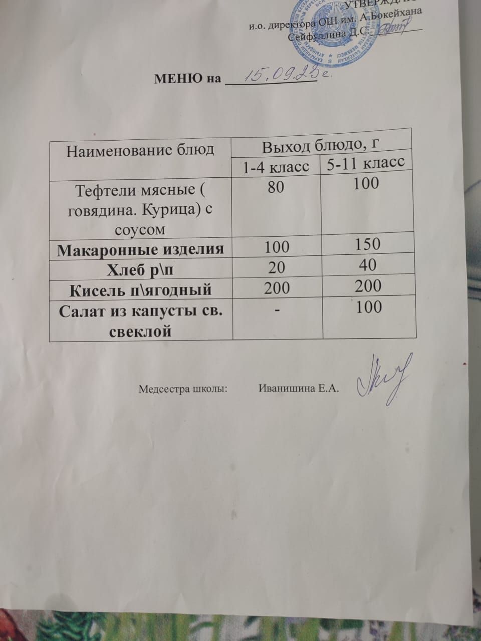 С целью организации рационального питания в ОШ им. А.Бокейхана 15.09.23г. бракеражной комиссией осуществлён мониторинг качества питания.