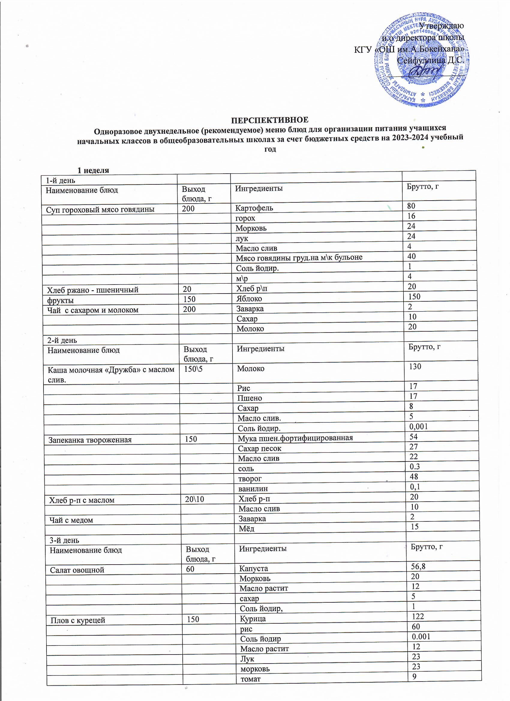 Перспективное двухнедельное меню блюд для организации питания учащихся начальных классов а также 5-11 классов в КГУ ОШ им Алихана Бокейхана 2024-2025 учебный год