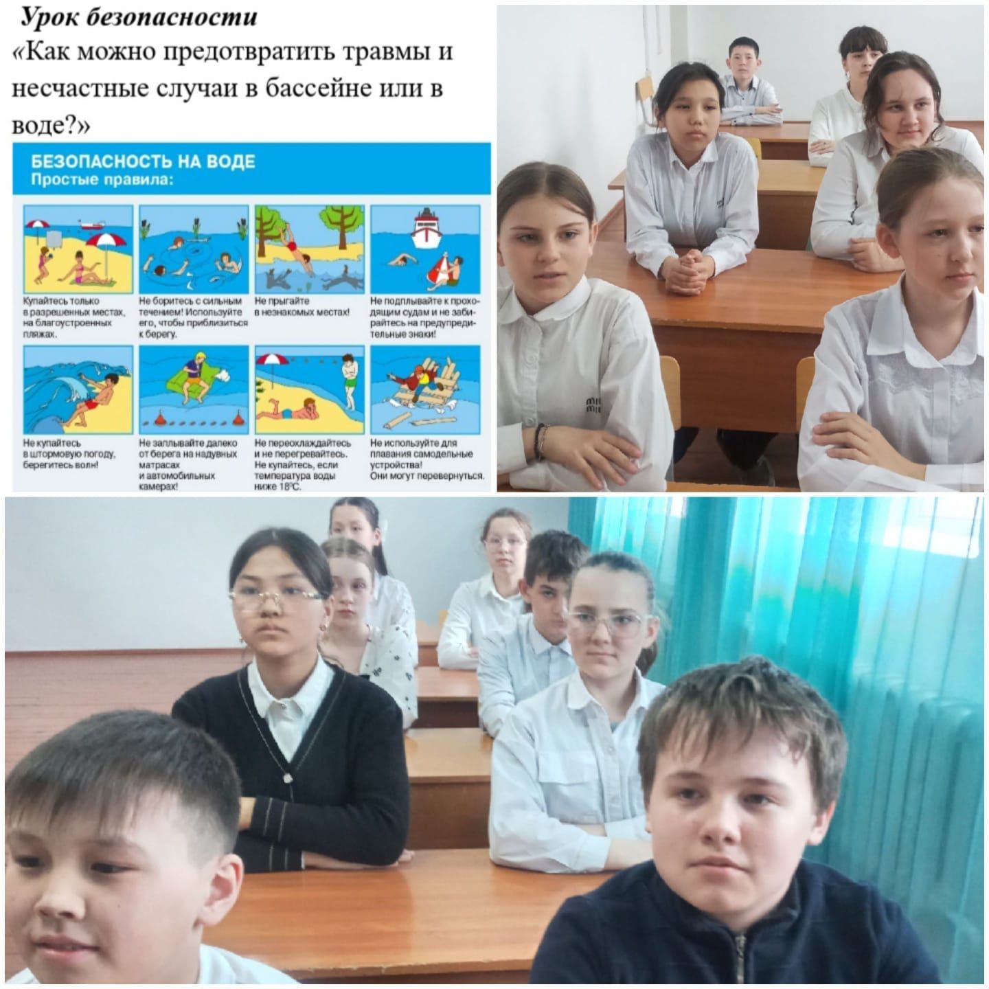 На уроке безопасности учащиеся 6 класса рассмотрели основные причины несчастных случаев в воде, меры профилактики в бассейне, на открытой воде, учились отработке умения оказания первой помощи при не…