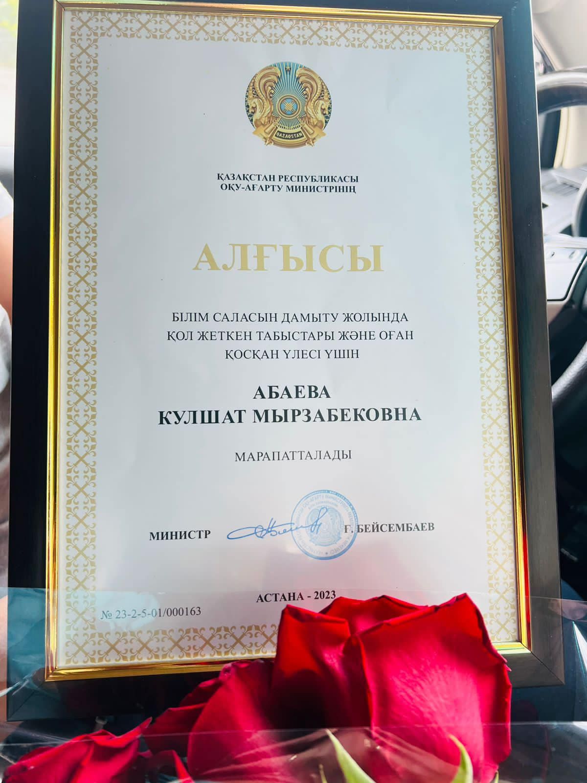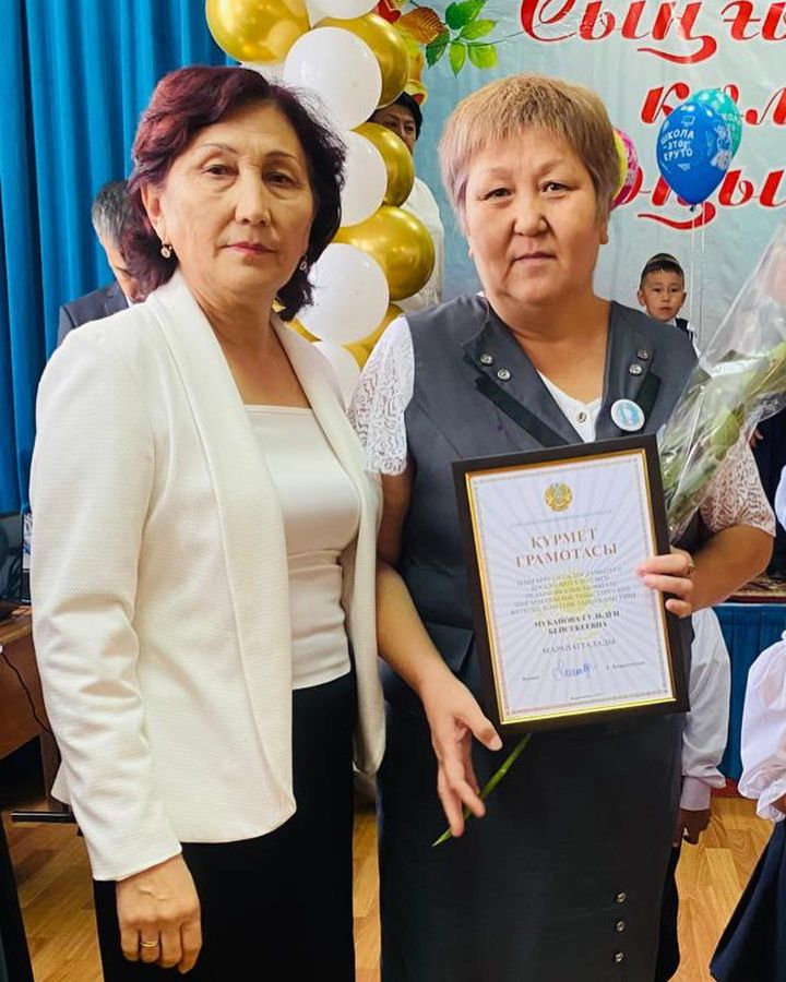 Мектебіміздің математика пәнінің ұстазы Абаева Кулшат Мырзабековна білім саласын дамыту жолында қол жеткен табыстары және оған қосқан үлесі үшін