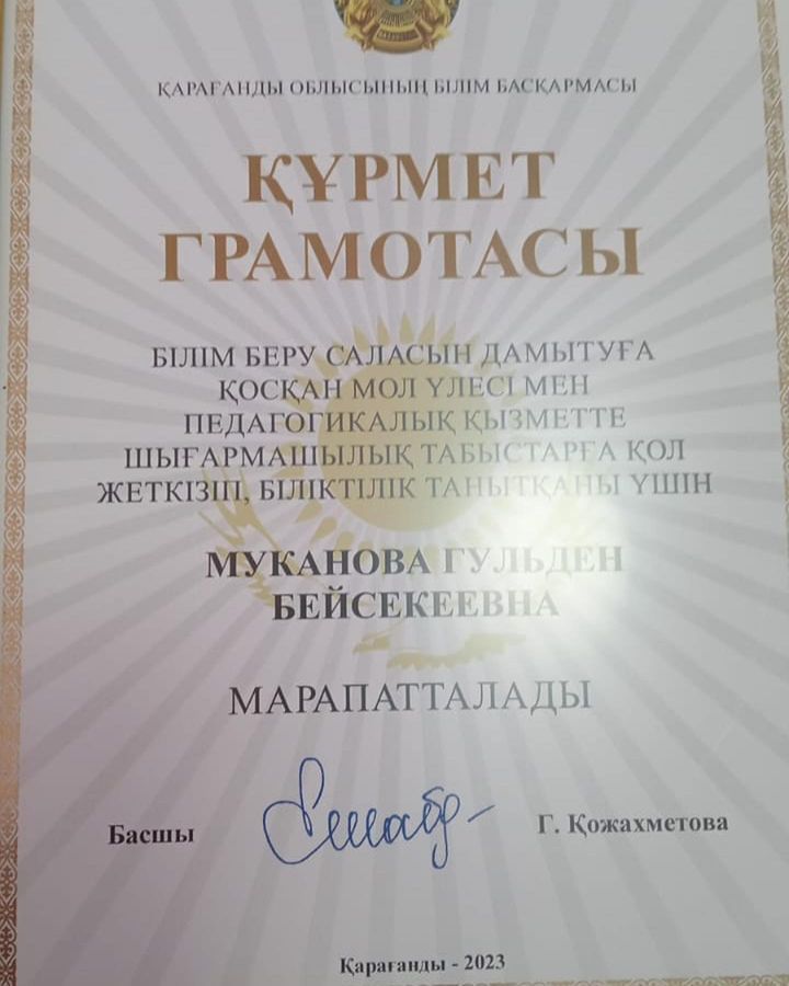 Қарағанды облысының білім басқармасы құрмет грамотасымен МАРАПАТТАЛДЫ