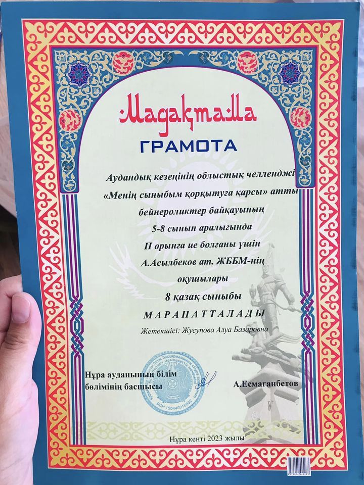 Аудандық кезеңінің облыстық челленджі «Менің сыныбым қорқытуға қарсы» атты бейнероликтер байқауының 5-8 сынып аралығында ІІ орынға ие болғаны үшін А.Асылбеков ат. ЖББМ-нің окушылары 8…