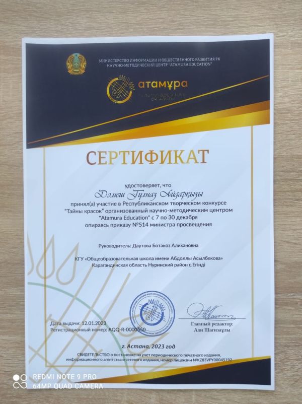 "Қанатты қалам" балалар танымдық журналы ұйымдастырған "Бояулар құпиялары" республикалық шығармашылық конкурсына қатысып 8-сынып оқушысы Дәмеш Гүлназ 1 орын иеленді. Құттықтаймыз…
