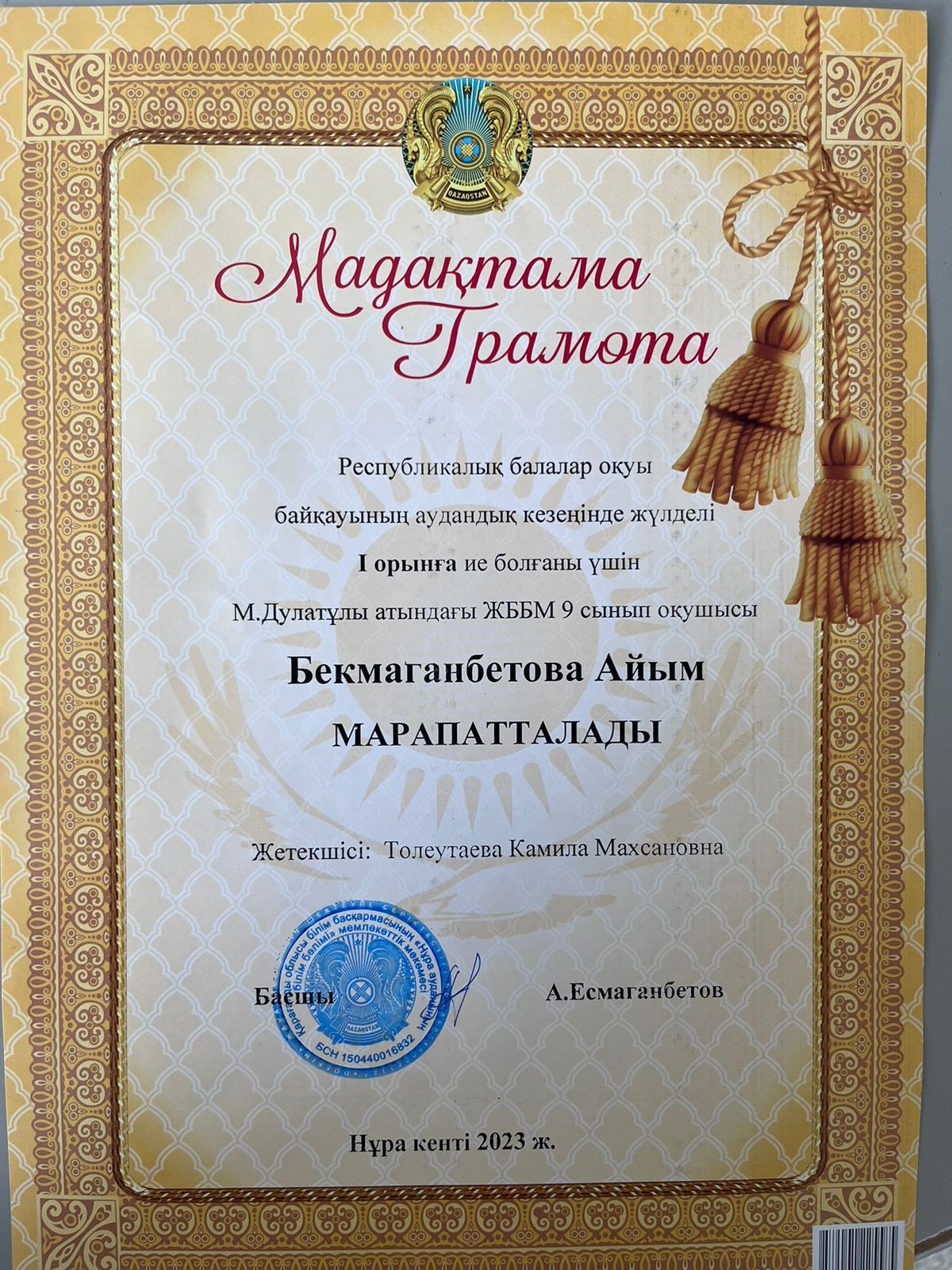 Ұстаздар күніне орай Міржақып Дулатұлы атындағы ЖББ мектебінің тарих пәнінің мұғалімі Тусупова Гульнар Амантаевна облыстық білім басқармасының Алғыс хатымен марапатталды. Сонымен қатар аудандық білі…