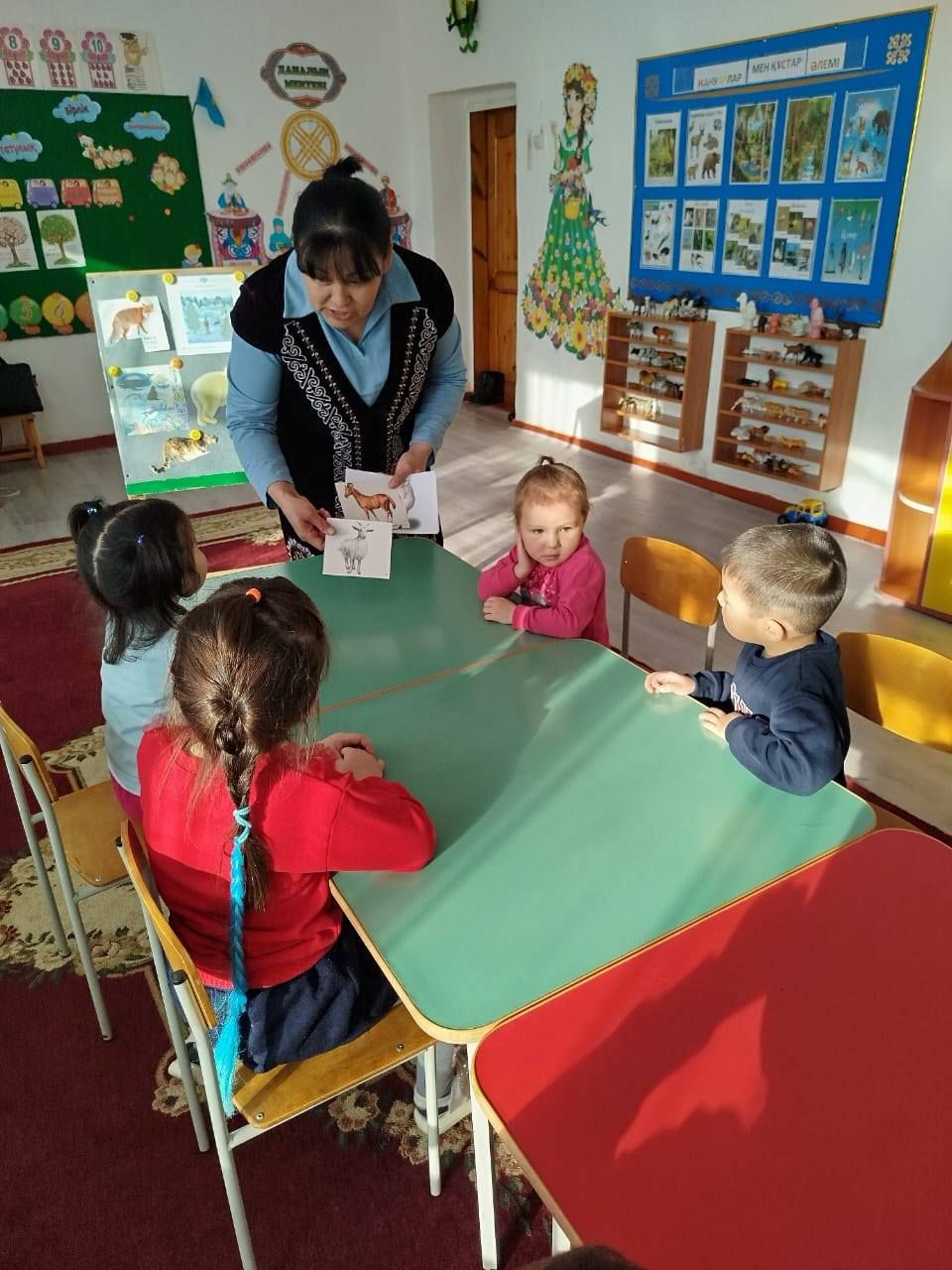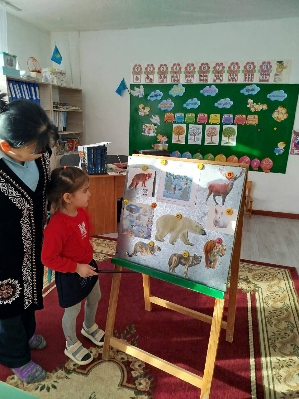 М. Дулатұлы атандағы ЖББМ жанындағы «Айгөлек» шағын орталығында қазақ тілі маманы А.Б. Сабитаева тәрбиеленушілермен «Үй жануарлары және жабайы жануарлары қандай болады?» тақы…