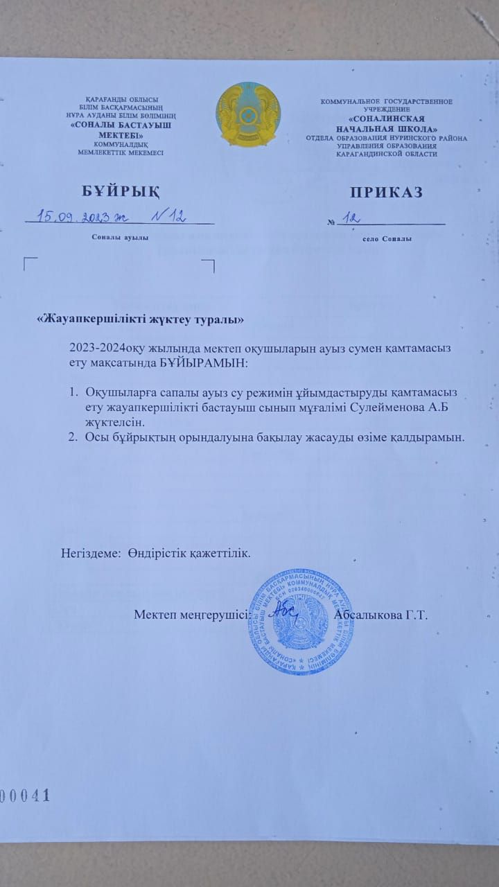 Ауыз суға жауапты адам тағайындау бұйрығы