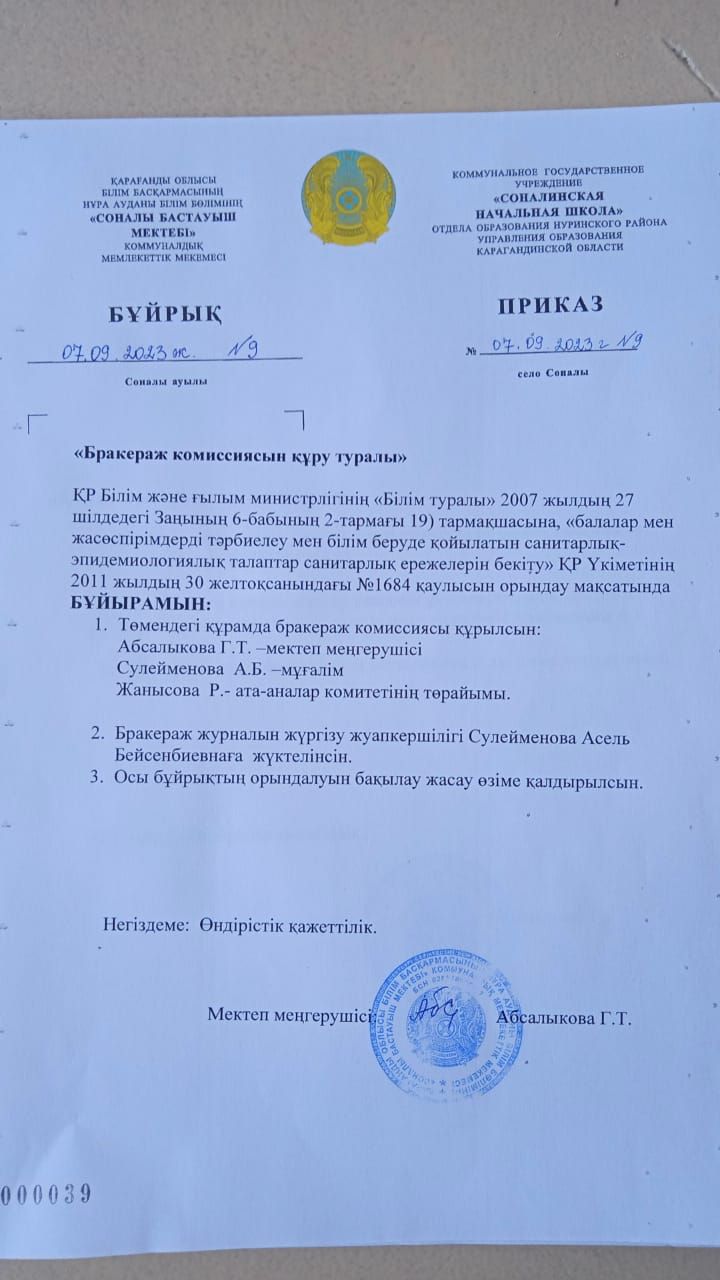 Бракераж  комиссиясын құру туралы бұйырығы