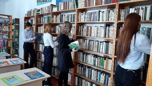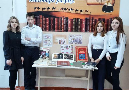 Библиотекарь Койбагарова В.В. вместе с учениками организовала оформление книжной выставки «Профессия на книжных страницах»