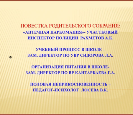 Ата-аналар жиналысына учаскелік полиция инспекторы А.К. Рахметов шақырылды , ол ата-аналарға "Дәріханалық нашақорлық" тақырыбында дәріс өткізді, онда ата-аналарды есірткіні тұтынушылар есі…