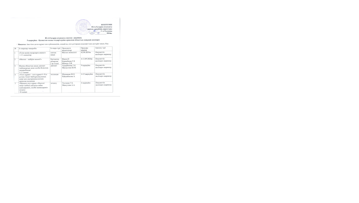 Ю.А.Гагарин атындағы мектеп- лицейінің 5 қыркүйек - Қазақстан халқы тілдері күніне арналған облыстықонкүндік жоспары