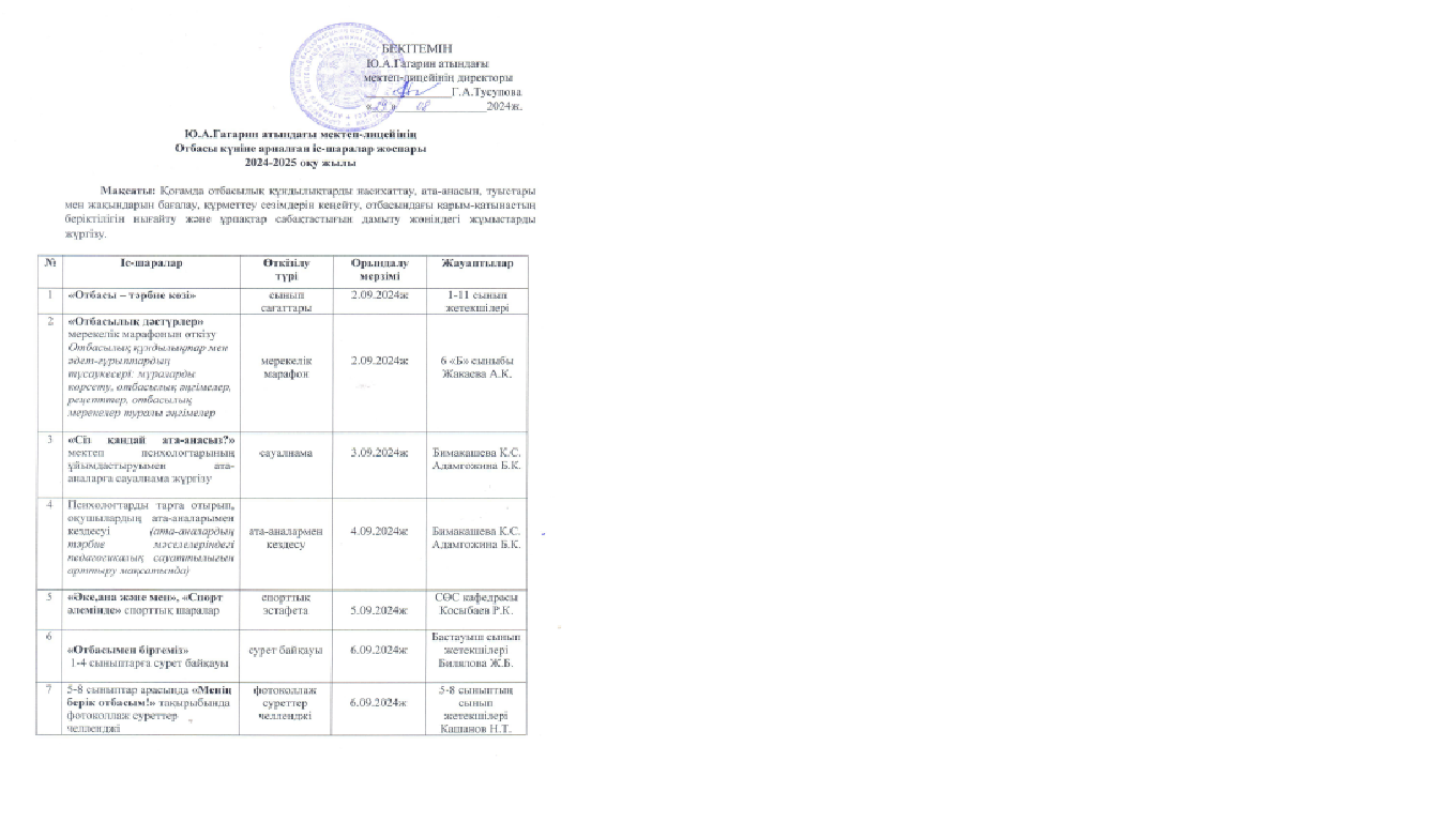 Ю.А.Гагарин атындағы мектеп-лицейінің Отбасы күніне арналған іс-шаралар жоспары 2024-2025 оқу жылы