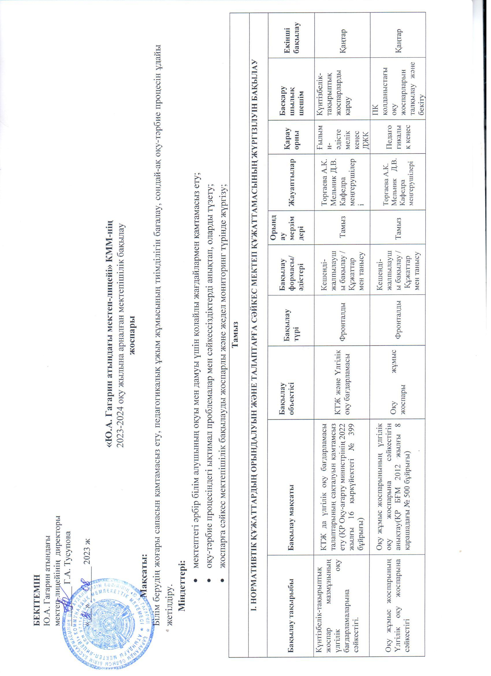 «Ю.А. Гагарин атындағы мектеп-лицейі» КММ-нің 2023-2024 оқу жылына арналған мектепішілік бақылау жоспары