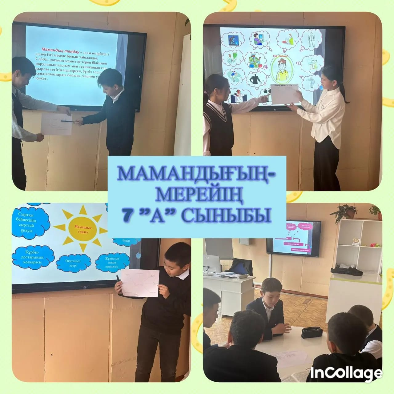 Педагогикалық сыныптың жұмыс жоспары бойынша 8- сәуір  күні «Мамандығың-мерейің» атты сынып сағаты өткізілді.  Мақсаты: жеке тұлғаның сан алуан мамандықтарға деген ынта ықыласт…