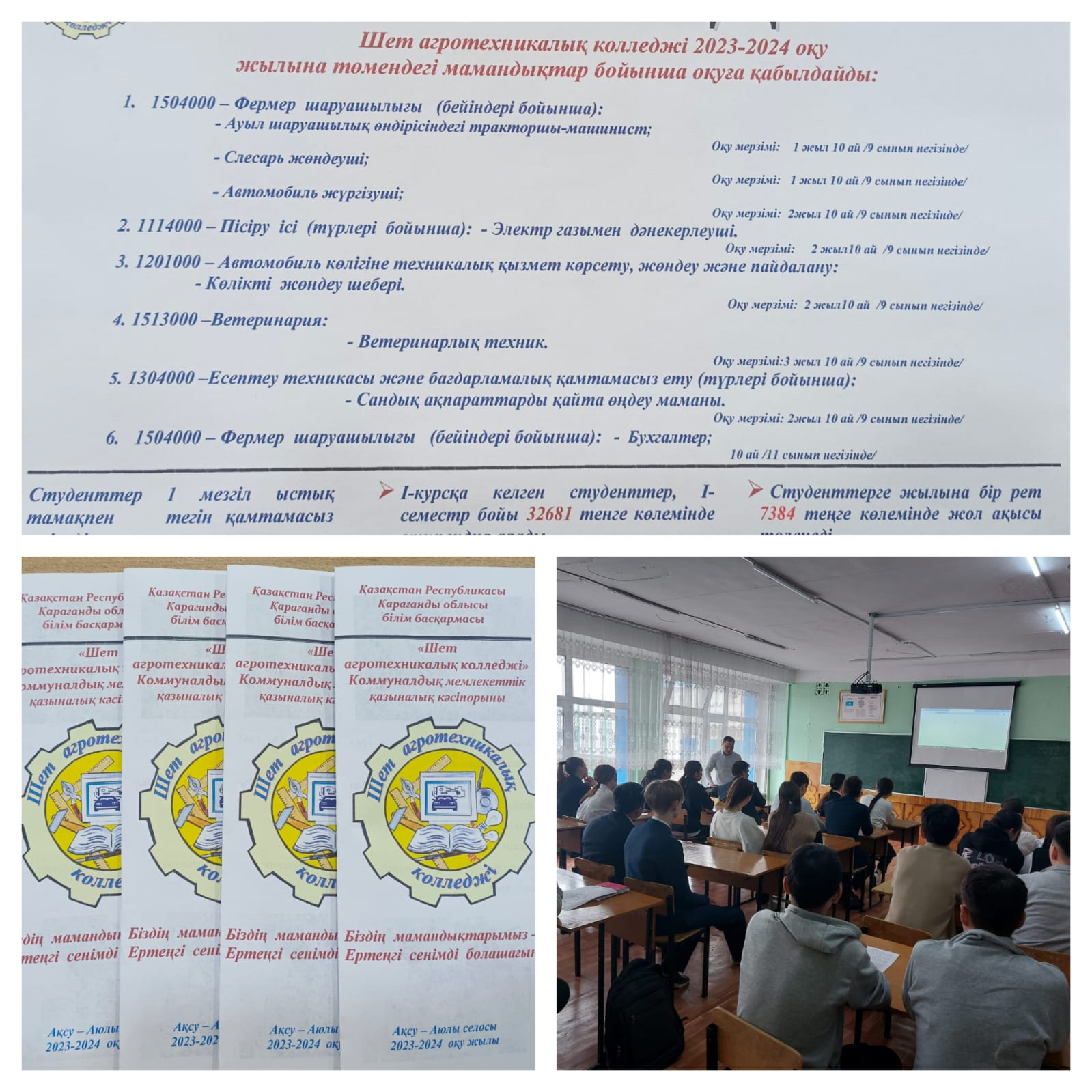 Кәсіптік бағыт-бағдар беру бойынша "Шет агротехникалық колледжі" Коммуналдық мемлекеттік мекемесінің аға оқытушылары келіп. 9 сынып оқушыларымен кездесу ұйымдастырды.Кездесу барысында колл…