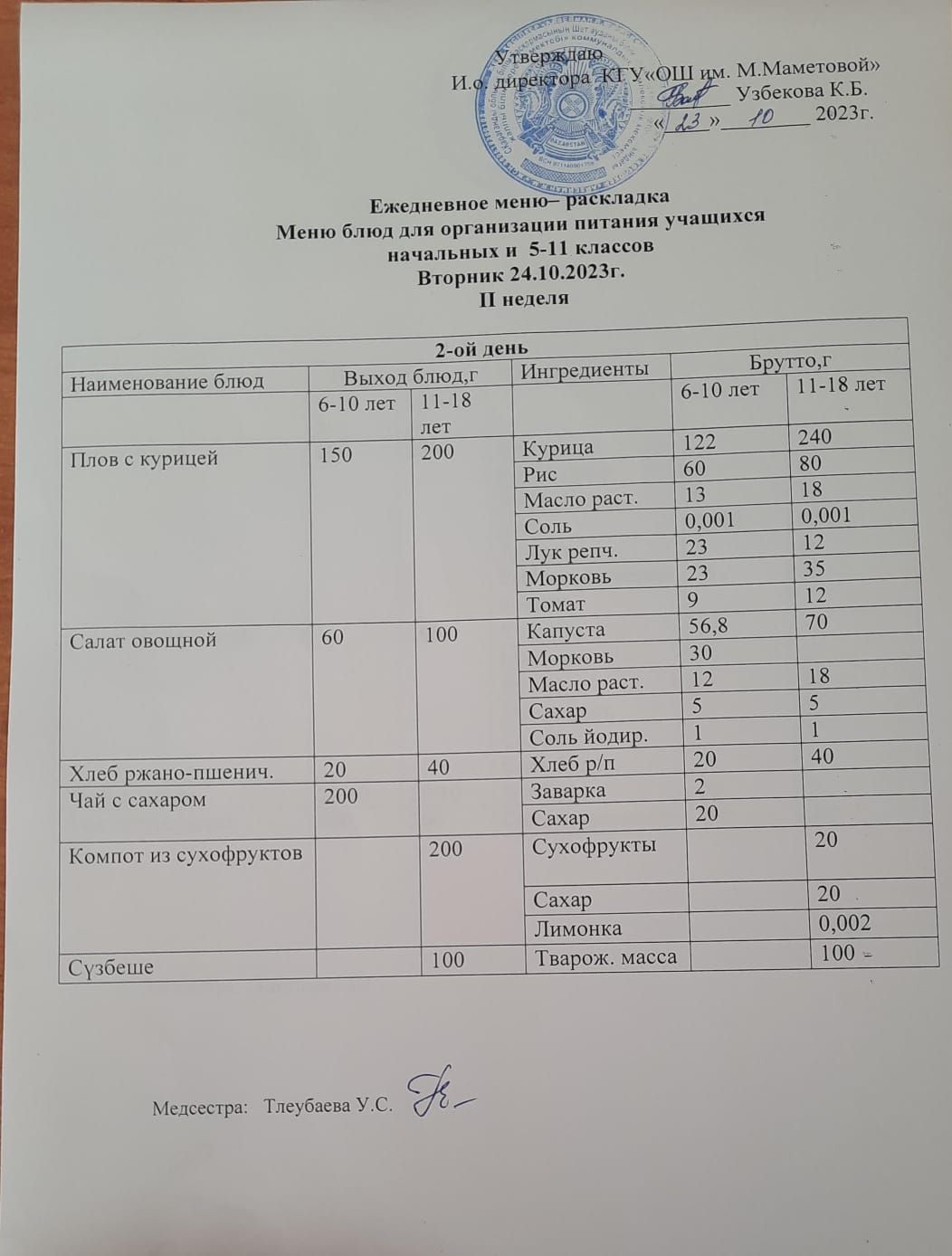 МЕНЮ ДЛЯ ОРГАНИЗАЦИИ БЕСПЛАТНОГО ПИТАНИЯ УЧАЩИХСЯ ДЛЯ НАЧАЛЬНЫХ КЛАССОВ И 5 - 11 КЛАССОВ СОЦИАЛЬНЫХ ДЕТЕЙ НА 24.10.2023