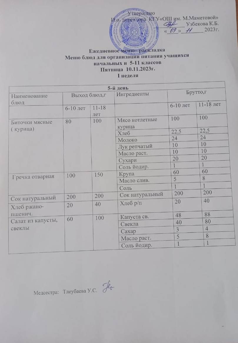 МЕНЮ ДЛЯ ОРГАНИЗАЦИИ БЕСПЛАТНОГО ПИТАНИЯ УЧАЩИХСЯ ДЛЯ НАЧАЛЬНЫХ КЛАССОВ И 5 - 11 КЛАССОВ СОЦИАЛЬНЫХ ДЕТЕЙ НА 10.11.2023