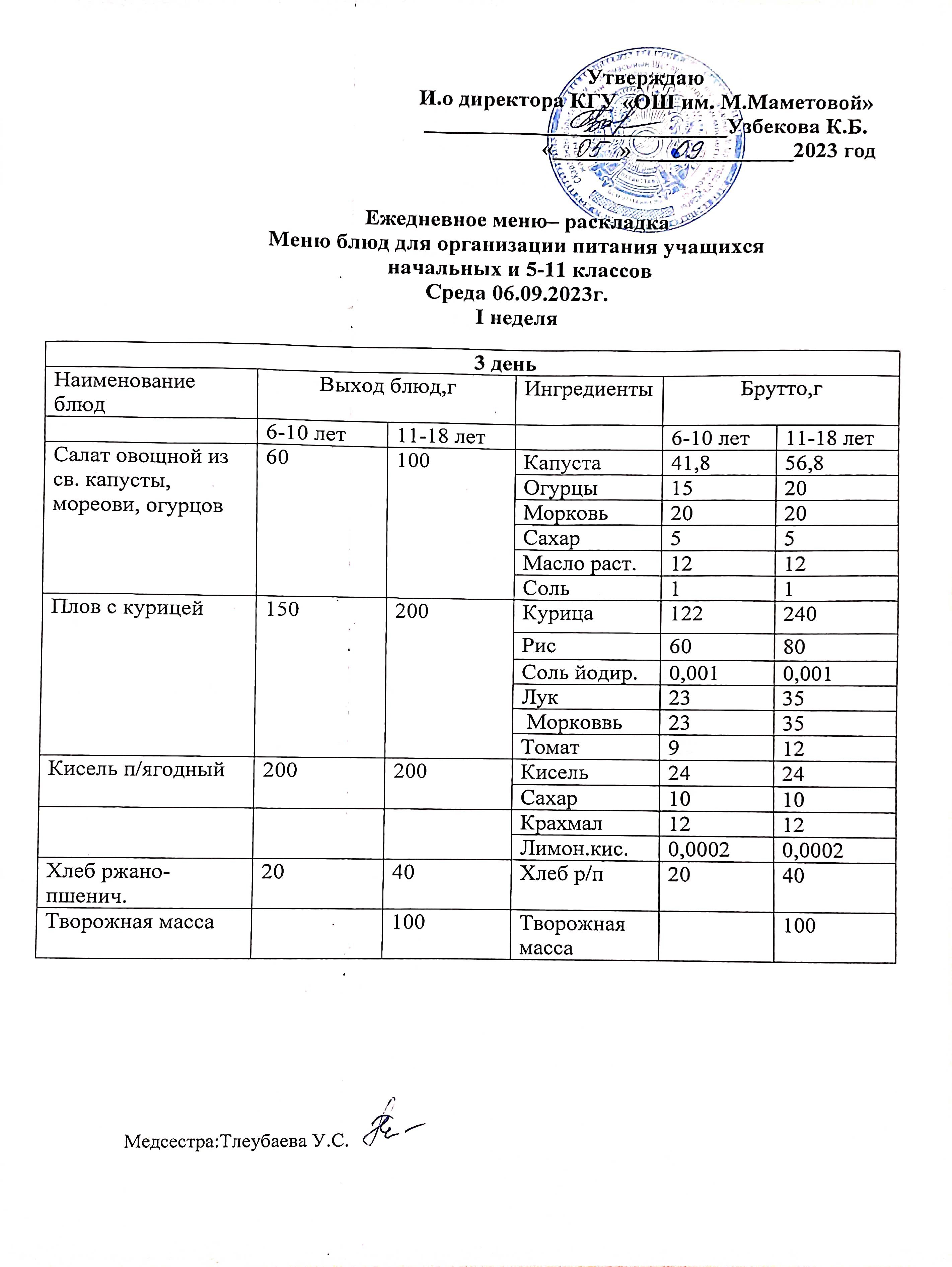 Меню для организации бесплатного питания учащихся для начальных классов и 5 - 11 классов социальных детей на 06.09.2023