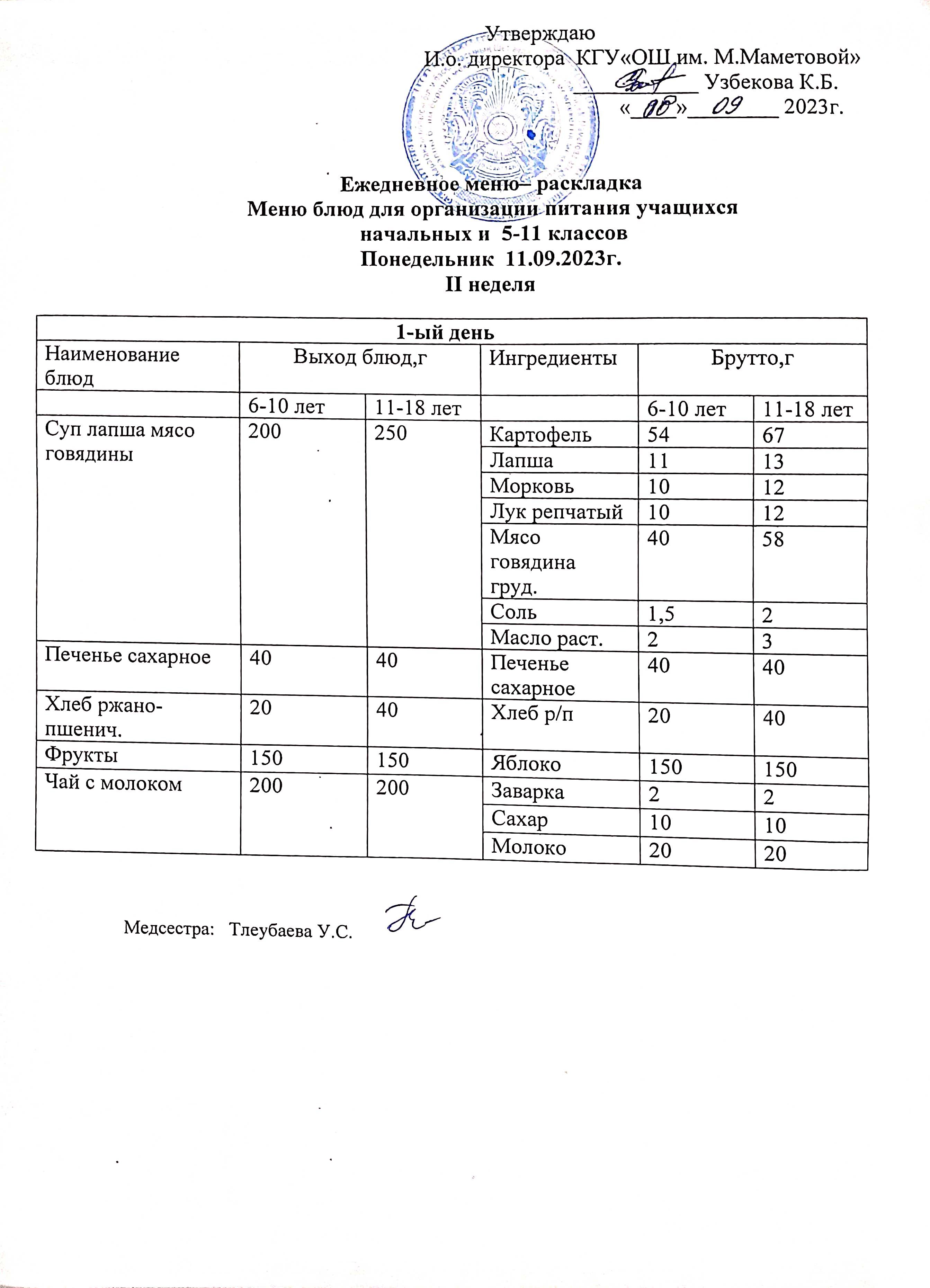 Меню для организации бесплатного питания учащихся для начальных классов и 5 - 11 классов социальных детей на 11.09.2023