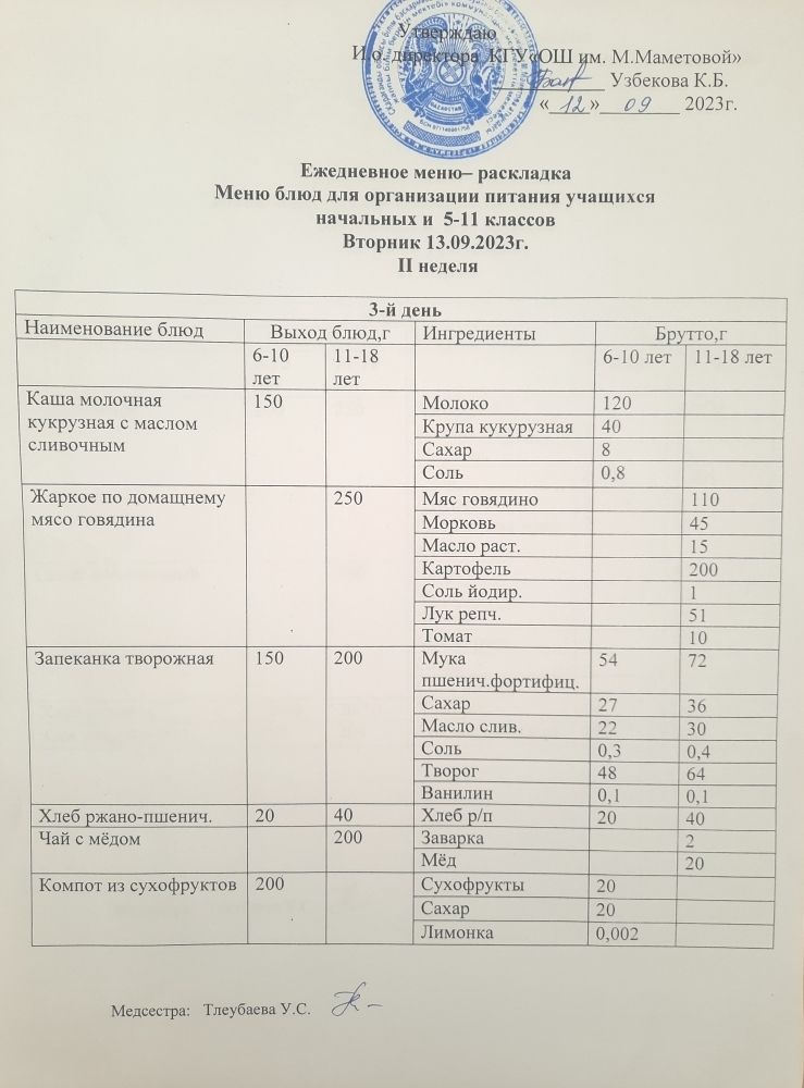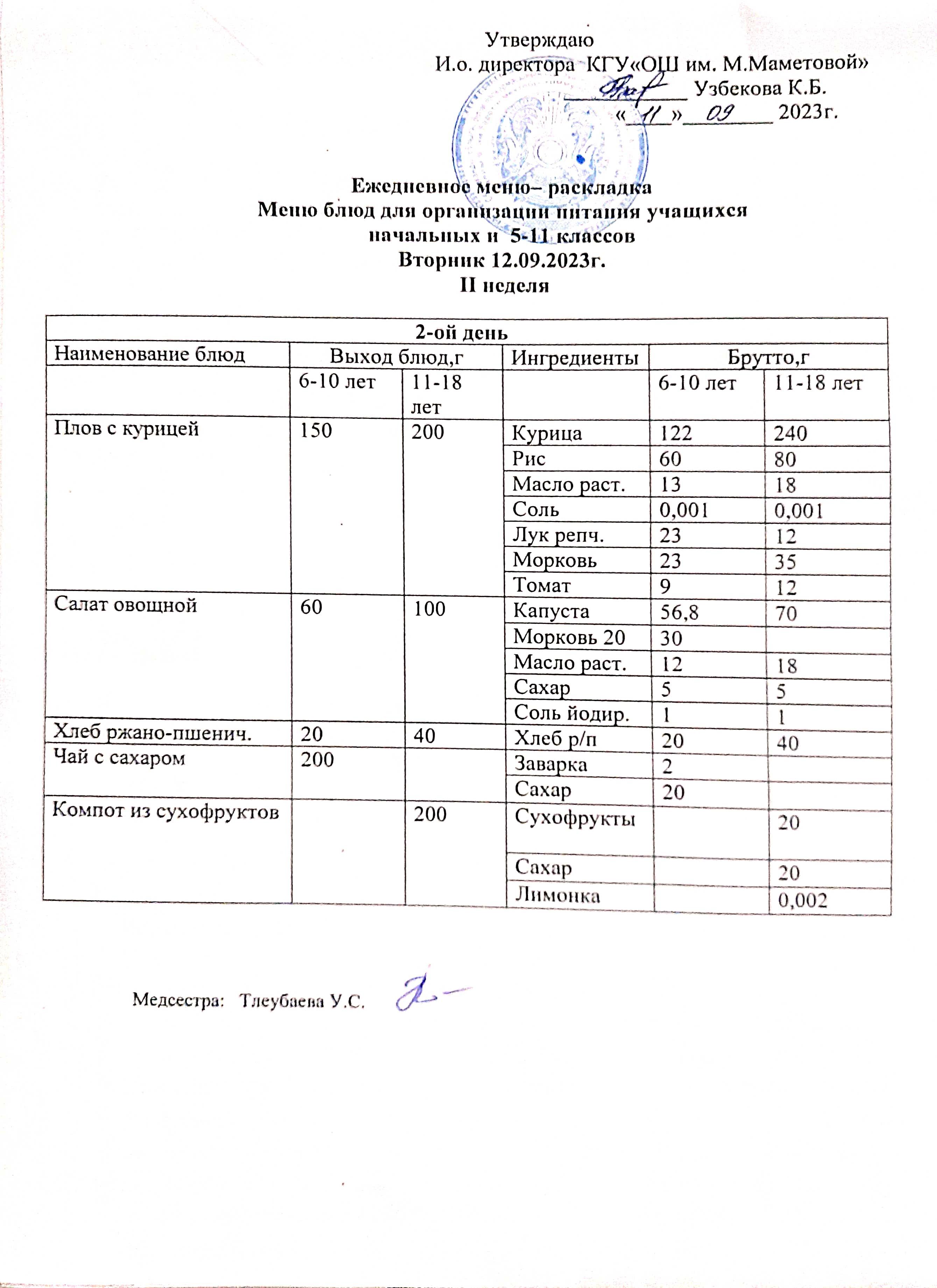Меню для организации бесплатного питания учащихся для начальных классов и 5 - 11 классов социальных детей на 12.09.2023