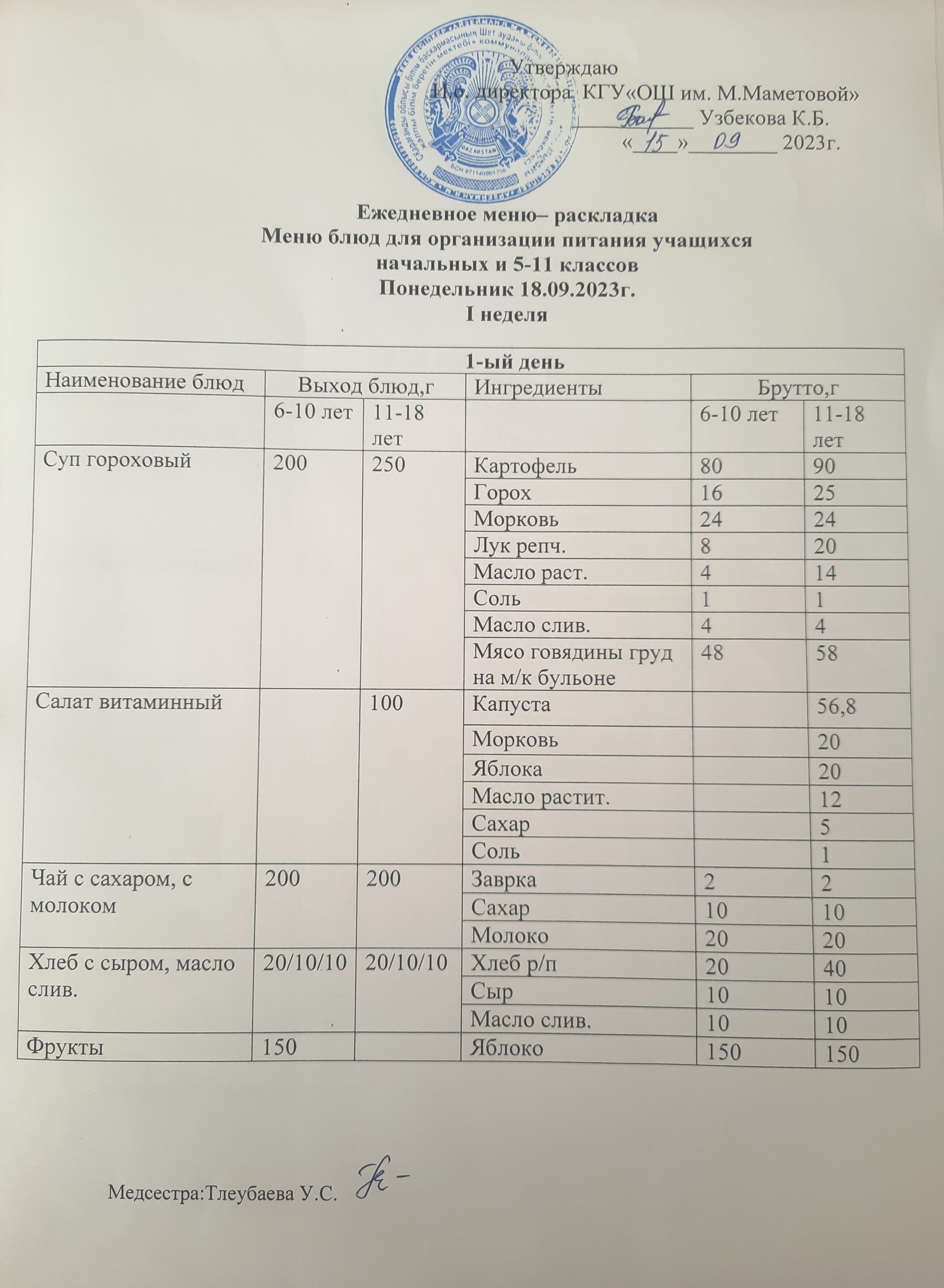 Меню для организации бесплатного питания учащихся для начальных классов и 5 - 11 классов социальных детей на 18.09.2023
