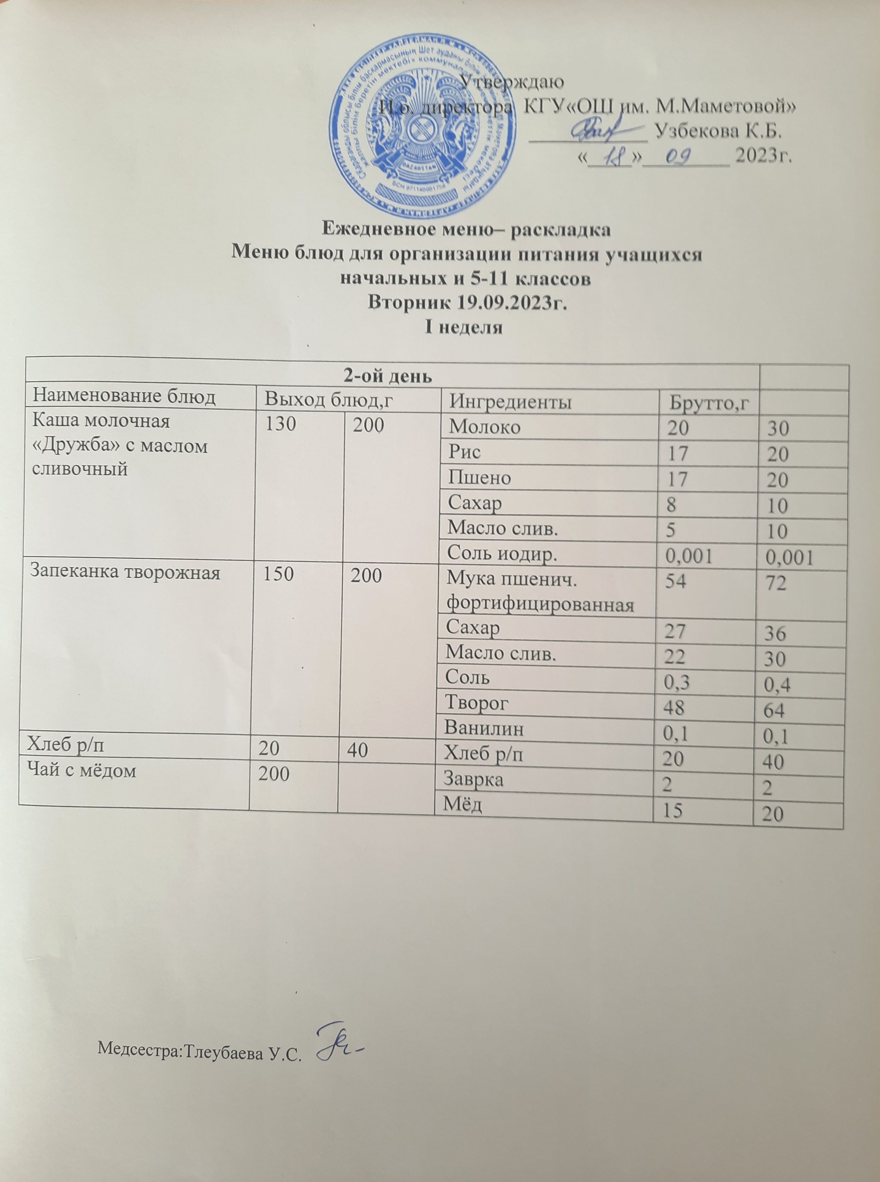 Меню для организации бесплатного питания учащихся для начальных классов и 5 - 11 классов социальных детей на 19.09.2023