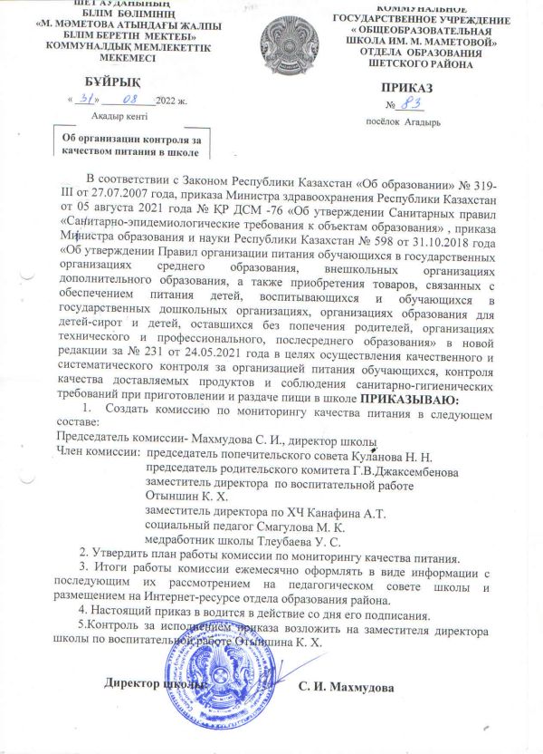 ОБ ОРГАНИЗАЦИИ КОНТРОЛЯ ЗА КАЧЕСТВОМ ПИТАНИЯ В ШКОЛЕ
