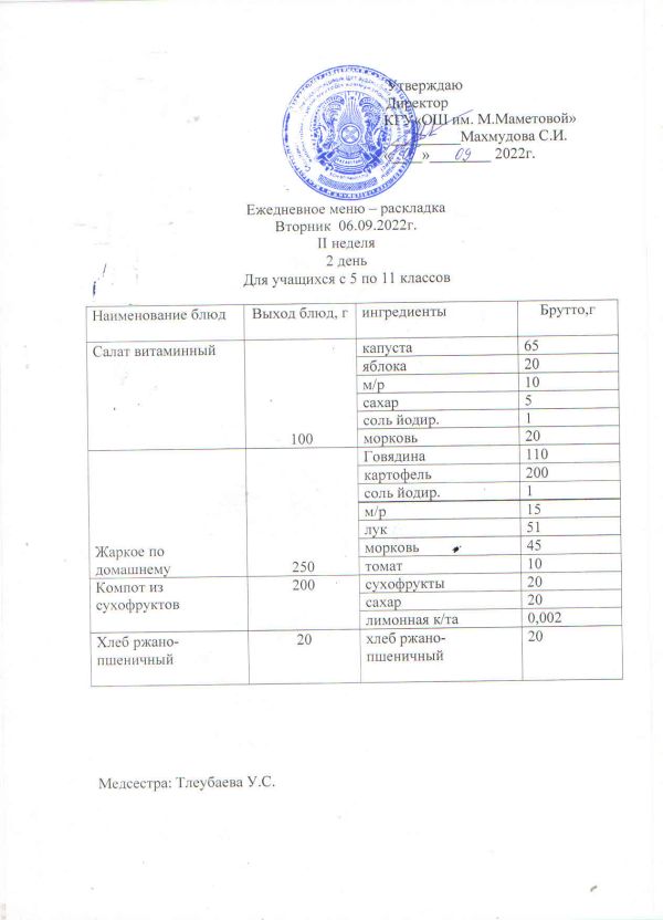 Күнделікті мәзір. 14.09.2022 жж