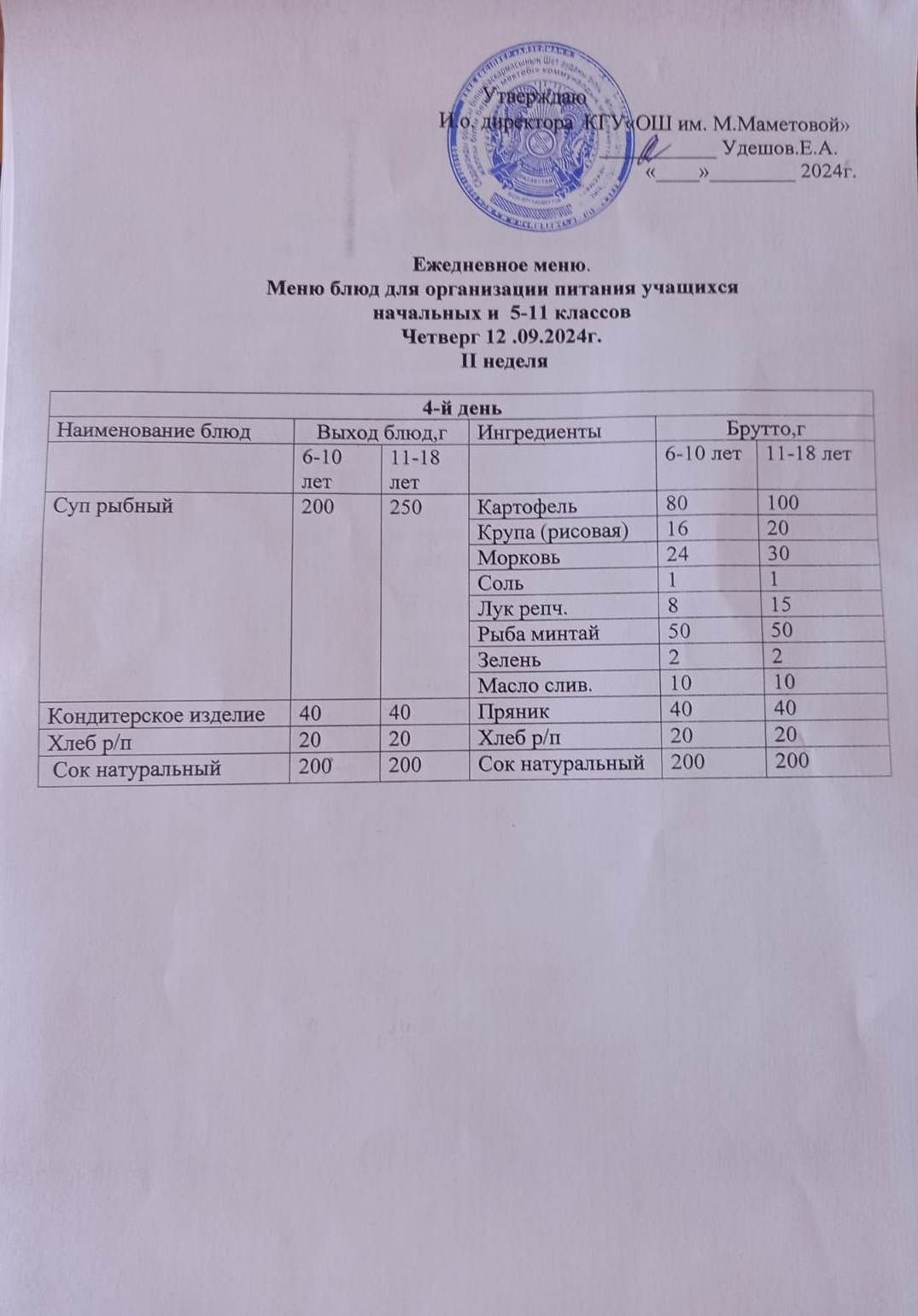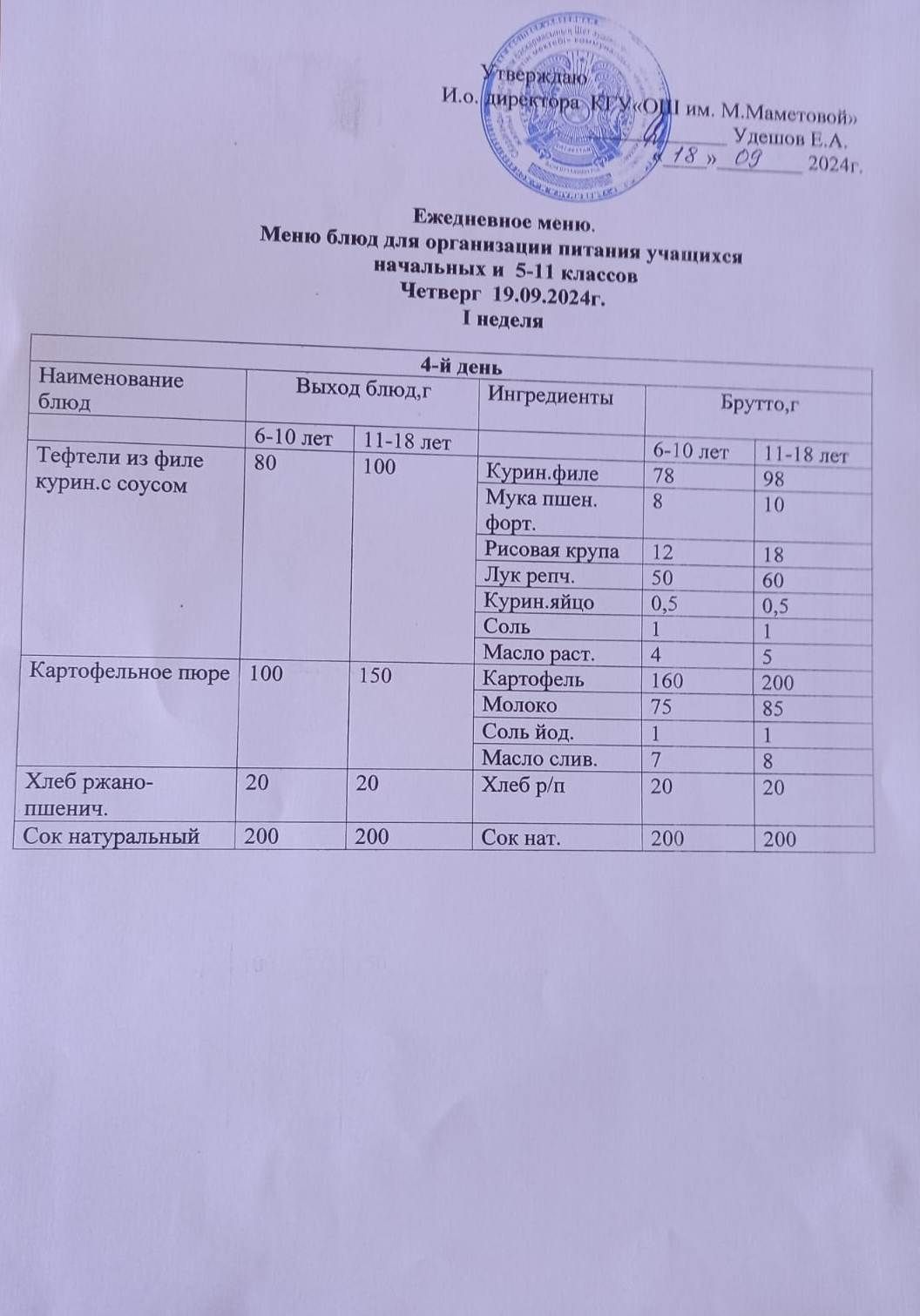 12.09.2024 БАСТАУЫШ СЫНЫПТАР МЕН 5 – 11 СЫНЫПТЫҢ ӘЛЕУМЕТТІК ОСАЛ ТОП ОҚУШЫЛАРЫНЫҢ ТЕГІН ТАМАҚТАНУЫН ҰЙЫМДАСТЫРУҒА АРНАЛҒАН АС МӘЗІРІ