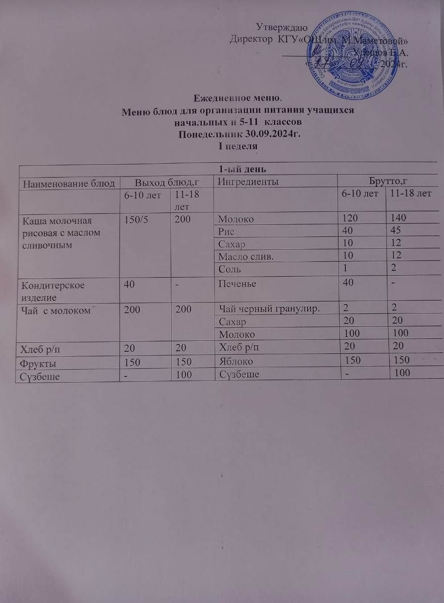 01.10.2024 КҮНІНЕ БАСТАУЫШ СЫНЫПТАР МЕН 5 – 11 СЫНЫПТЫҢ ӘЛЕУМЕТТІК ОСАЛ ТОП ОҚУШЫЛАРЫНЫҢ ТЕГІН ТАМАҚТАНУЫН ҰЙЫМДАСТЫРУҒА АРНАЛҒАН АС МӘЗІРІ