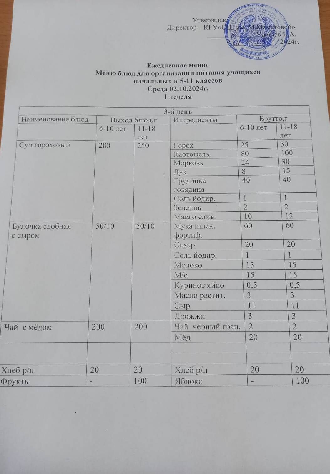 02.10.2024 КҮНІНЕ БАСТАУЫШ СЫНЫПТАР МЕН 5 – 11 СЫНЫПТЫҢ ӘЛЕУМЕТТІК ОСАЛ ТОП ОҚУШЫЛАРЫНЫҢ ТЕГІН ТАМАҚТАНУЫН ҰЙЫМДАСТЫРУҒА АРНАЛҒАН АС МӘЗІРІ