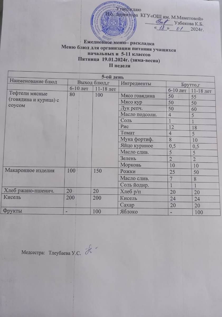19.01.2024 БАСТАУЫШ СЫНЫПТАР МЕН 5 – 11 СЫНЫПТЫҢ ӘЛЕУМЕТТІК ОСАЛ ТОП ОҚУШЫЛАРЫНЫҢ ТЕГІН ТАМАҚТАНУЫН ҰЙЫМДАСТЫРУҒА АРНАЛҒАН АС МӘЗІРІ
