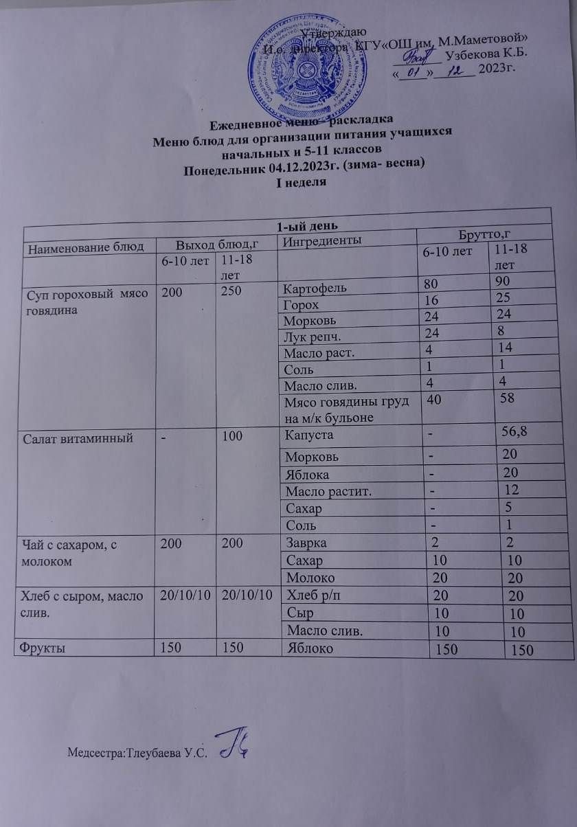 МЕНЮ ДЛЯ ОРГАНИЗАЦИИ БЕСПЛАТНОГО ПИТАНИЯ УЧАЩИХСЯ ДЛЯ НАЧАЛЬНЫХ КЛАССОВ И 5 - 11 КЛАССОВ СОЦИАЛЬНЫХ ДЕТЕЙ НА 04.12.2023