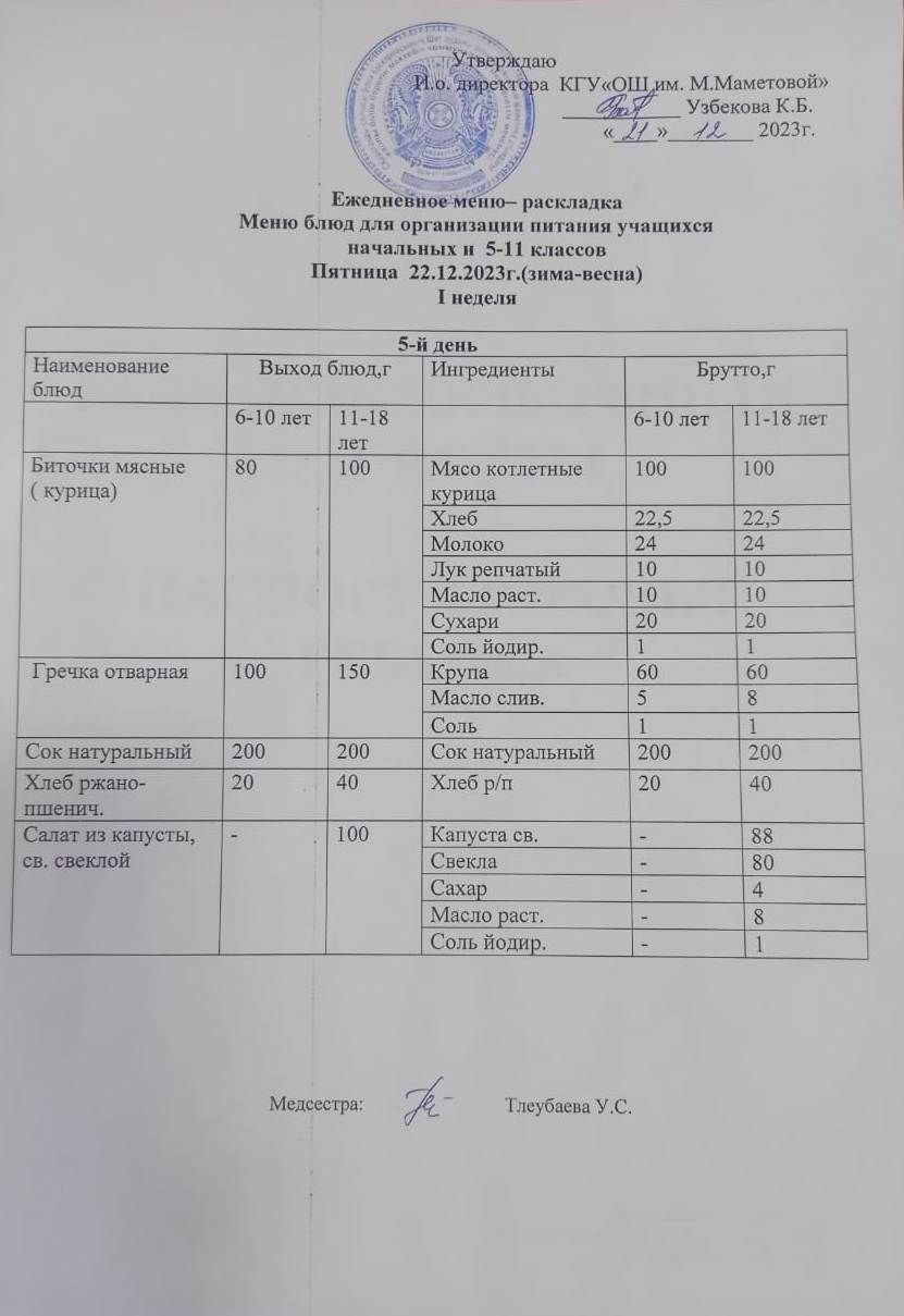 МЕНЮ ДЛЯ ОРГАНИЗАЦИИ БЕСПЛАТНОГО ПИТАНИЯ УЧАЩИХСЯ ДЛЯ НАЧАЛЬНЫХ КЛАССОВ И 5 - 11 КЛАССОВ СОЦИАЛЬНЫХ ДЕТЕЙ НА 22.12.2023