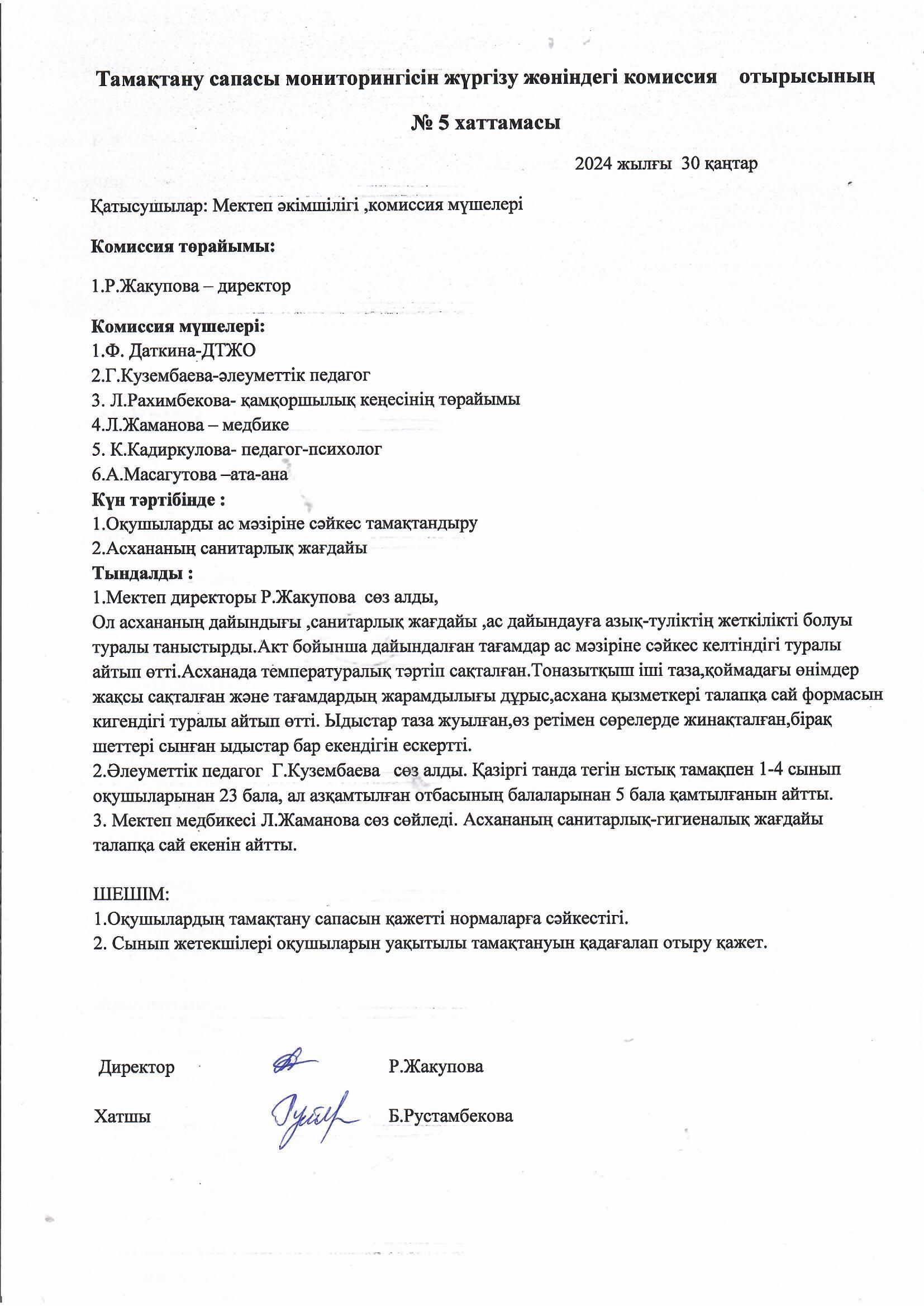 Тамақтану сапасына мониторингісін жүргізу комиссия отырысының № 5 хаттамасы